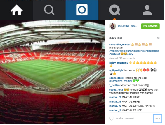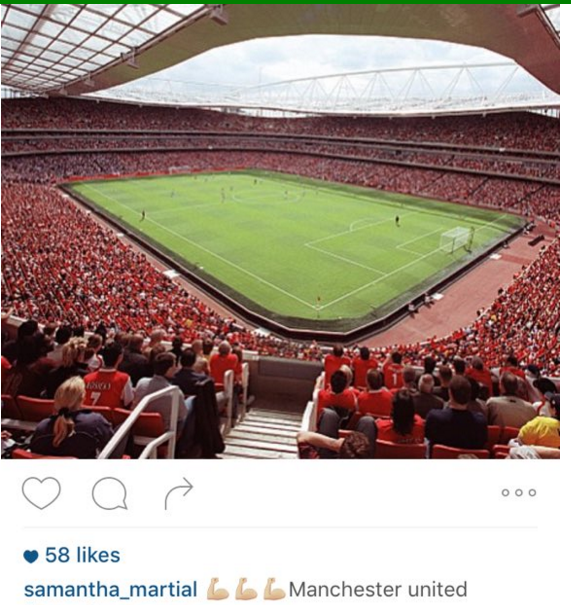 Cô nhầm sân Emirates của Arsenal thành sân của MU khi đăng bức ảnh "tổ ấm" của Arsenal với dòng chú thích: “MU, mạnh mẽ lên!”.