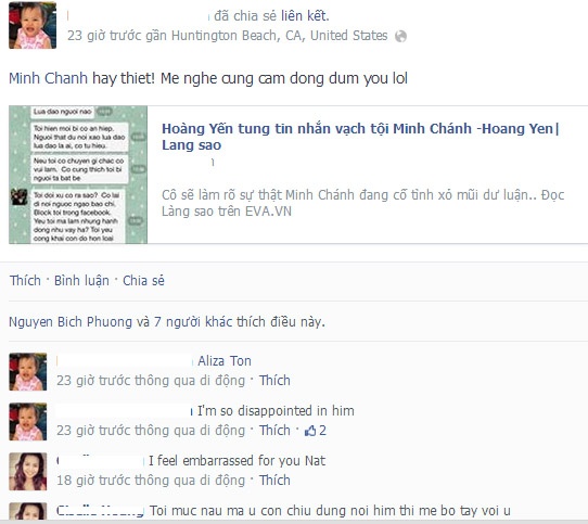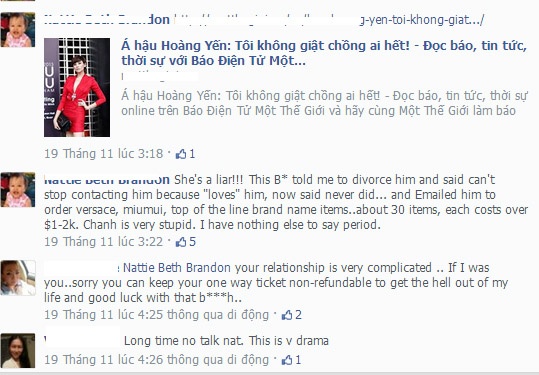 Lời nhận xét này được Nathanlee Truong dẫn kèm một đường link là bài báo phỏng vấn Hoàng Yến vào ngày 27/11, ngay sau khi ông bầu Minh Chánh công khai chuyện tình cảm sâu đậm hơn một năm nay với giám khảo Siêu mẫu Việt Nam 2013. Bà xã Minh Chánh nhận xét trong tâm trạng khá bức xúc. Chị cho rằng, Hoàng Yến đang nói dối bởi cách đây không lâu, chị và người mẫu này đã có một cuộc đối thoại. Trong đó, Hoàng Yến khẳng định không thể chia tay Minh Chánh vì đã trót yêu anh. Những lời lẽ này được chị viết bằng tiếng Anh có lẽ một phần không muốn quá nhiều cặp mắt tò mò, săm soi:
