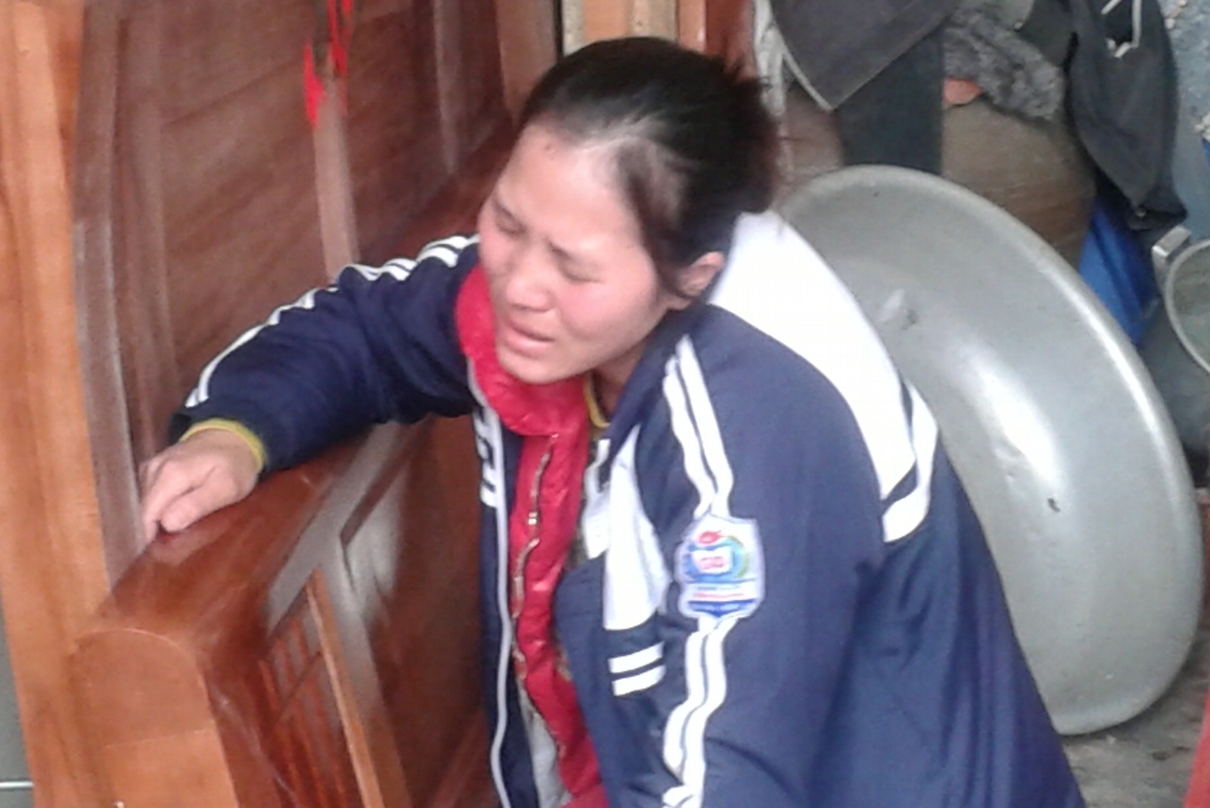 | Chị Thảo ôm lấy chiếc giường nơi đặt thi thể hai cha con anh Năng, cháu Đức gào khóc thảm thiết. |