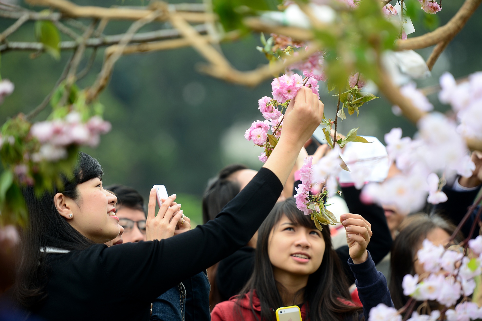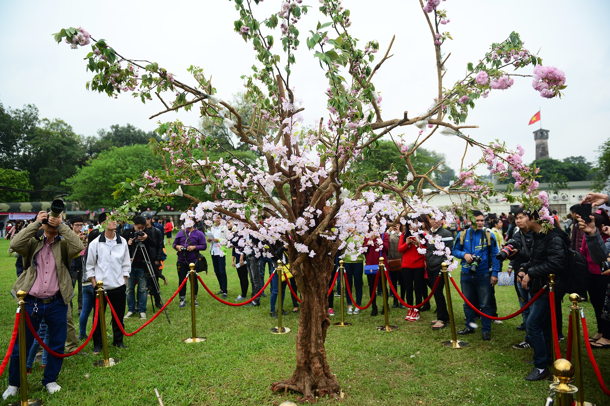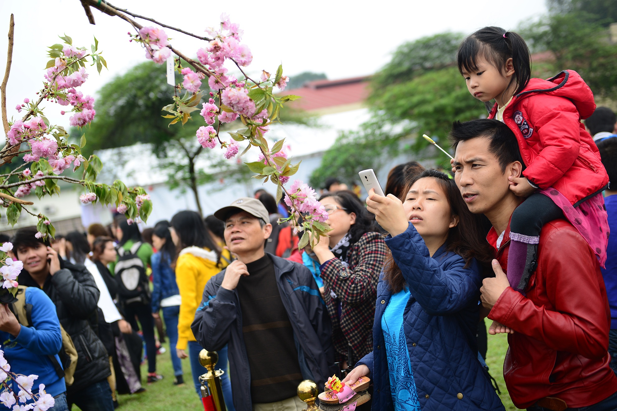 | Những cành hoa anh đào thật thu hút sự chú ý của rất nhiều người đến xem. Tại Nhật Bản, hoa anh đào (sakura) nở rộ suốt từ cuối tháng 1 cho đến đầu tháng 5 mỗi mùa và năm nay chỉ có 500 cành mang sang Việt Nam. |
