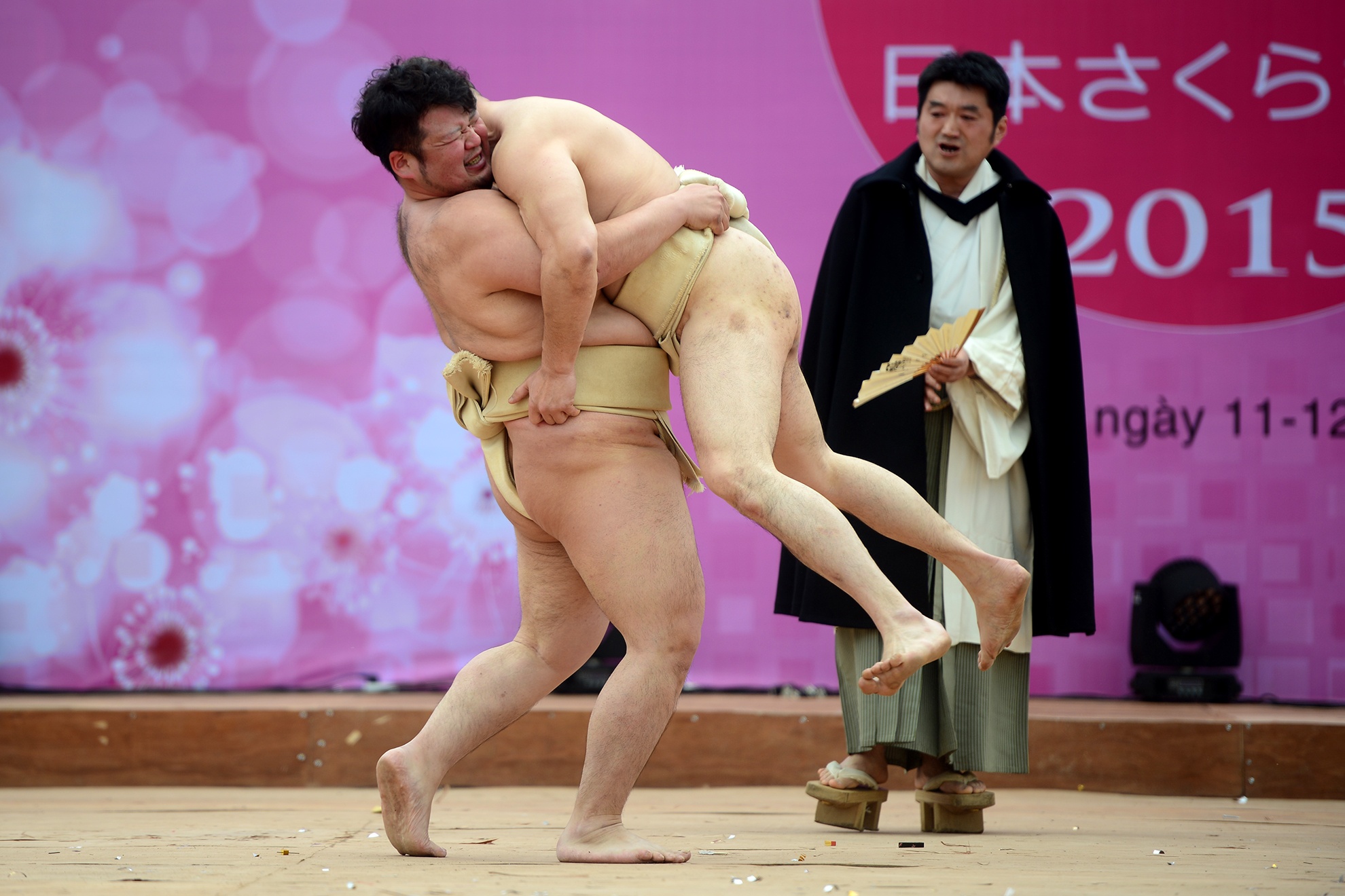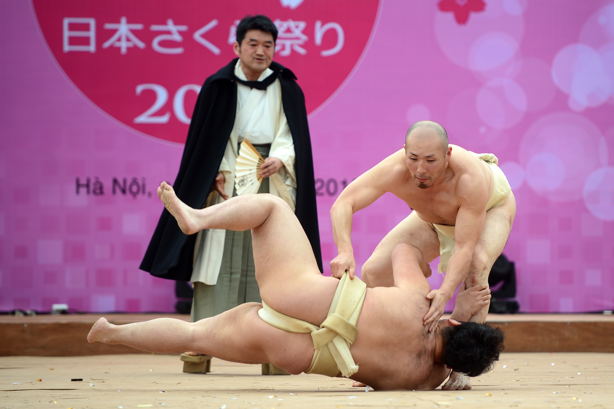 Hai võ sĩ to khỏe của Nhật Bản cởi trần đóng khố biểu diễn, thi đấu ngay tại Hoàng thành Thăng Long trong khuôn khổ lễ hội hoa anh đào Hà Nội, sáng 11/4.