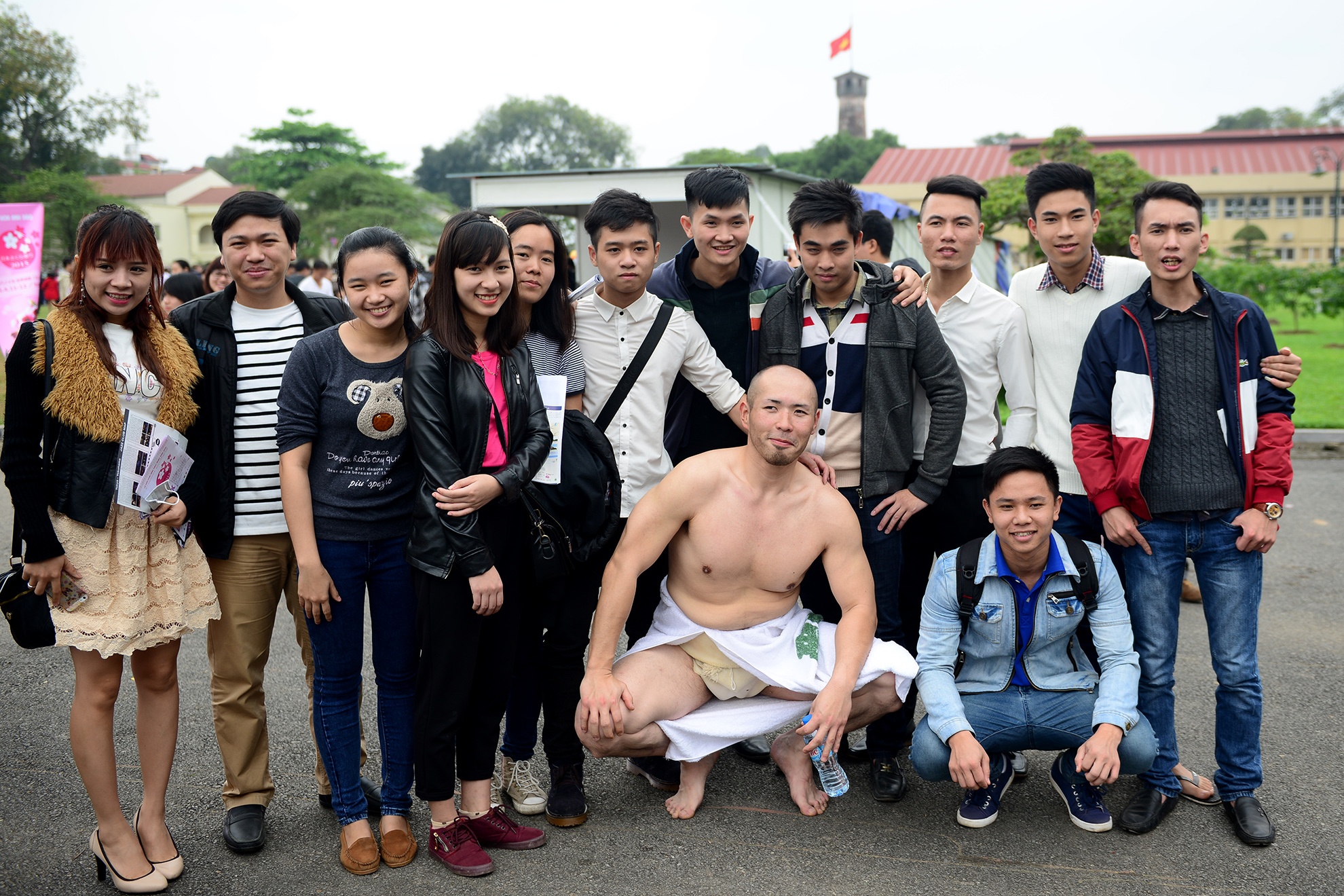 | Sau khi biểu diễn, võ sĩ sumo được các bạn trẻ xin chụp ảnh cùng. |