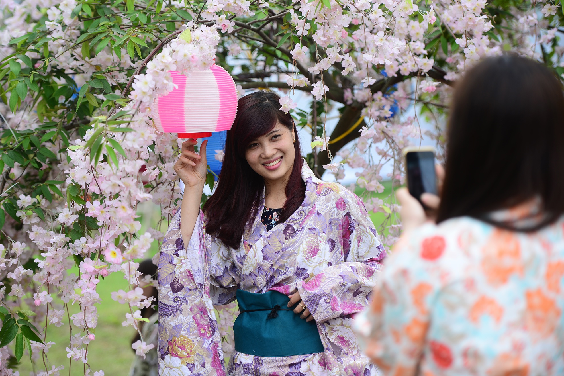 | Các cô gái Việt tha hồ diện kimono chụp ảnh bên cây hoa anh đào tượng trưng. |