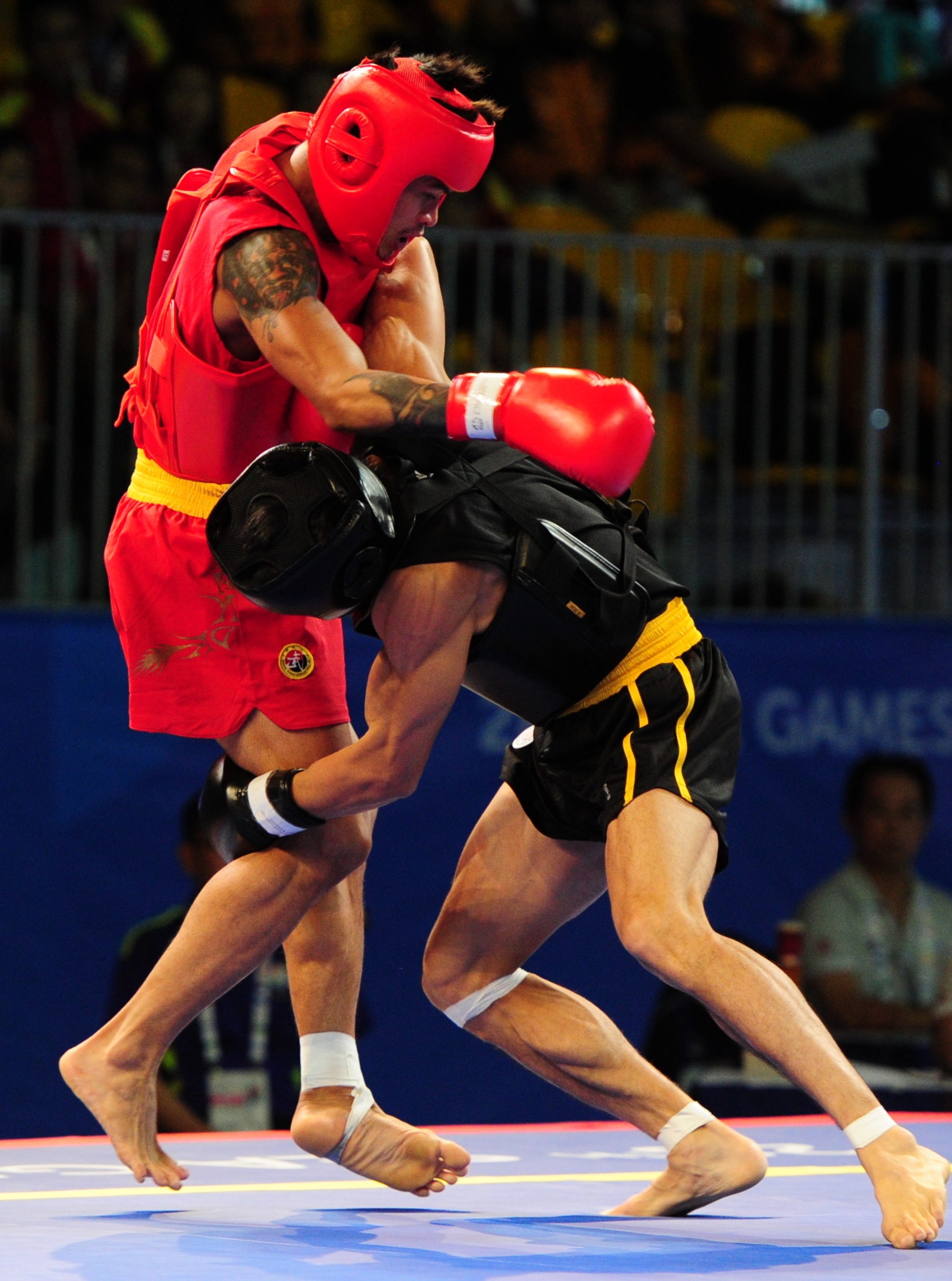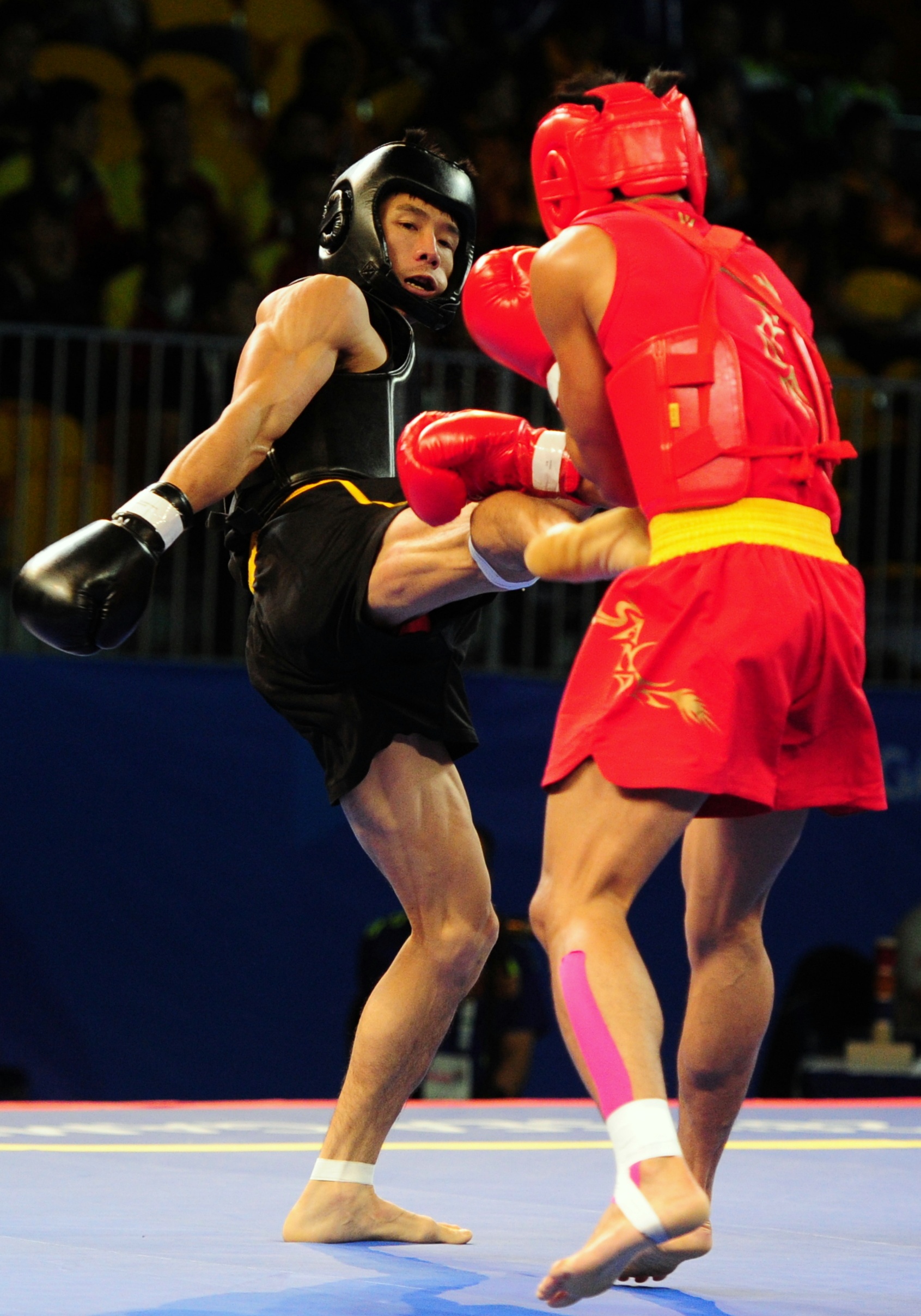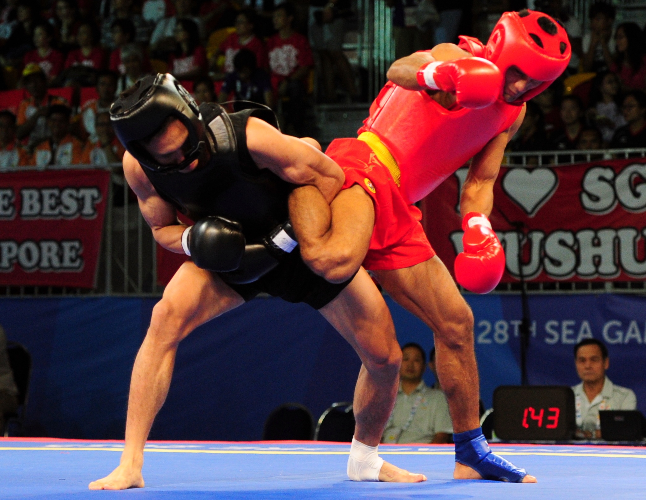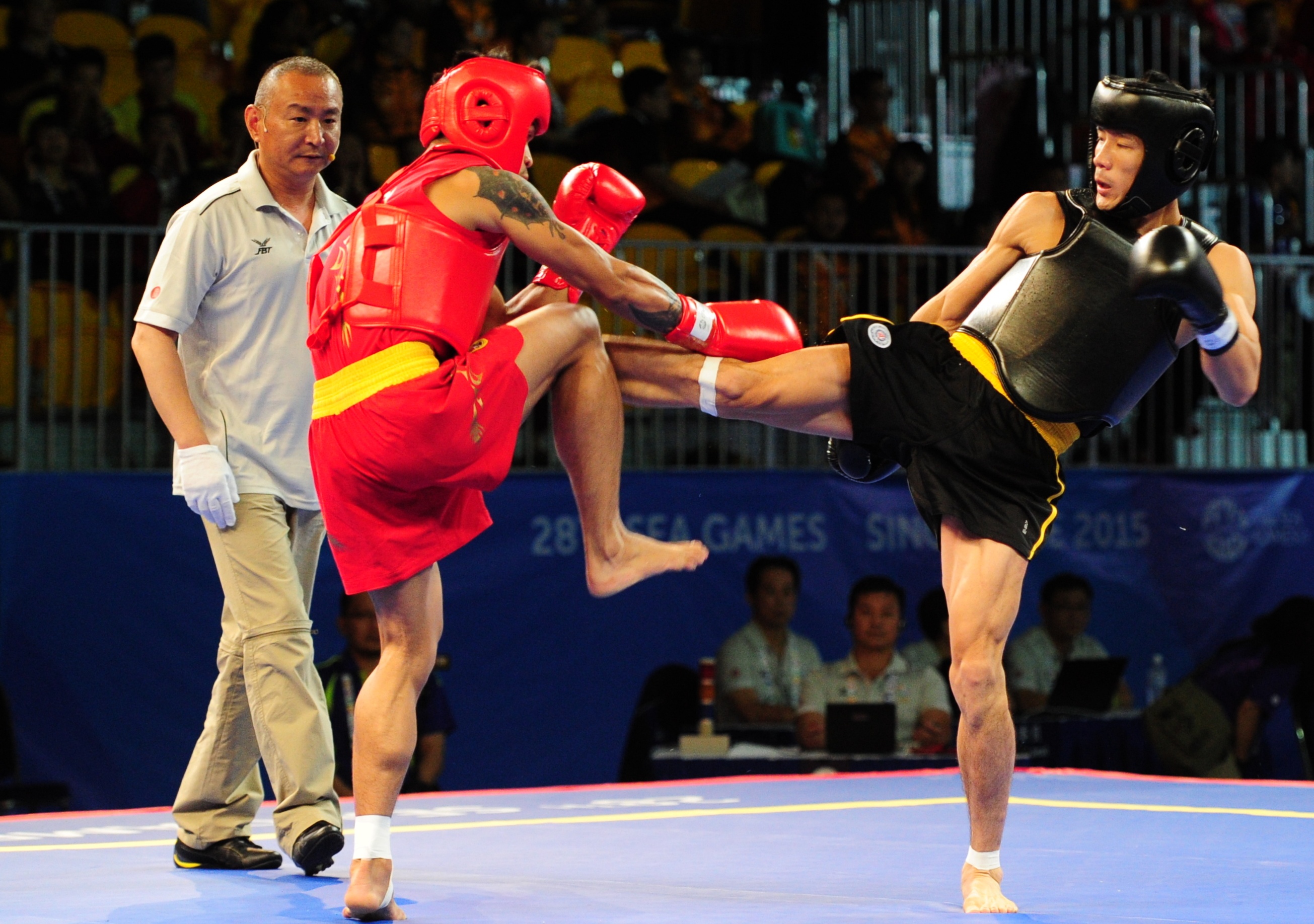 | Hoàng Văn Cao (giáp đen) bước vào chung kết đối kháng nội dung tán thủ cá nhân của wushu hạng cân 60 kg. VĐV Việt Nam gặp đối thủ Solis Francisco (Philippines, giáp đỏ) lúc 19h ngày 8/6 (giờ Việt Nam). |