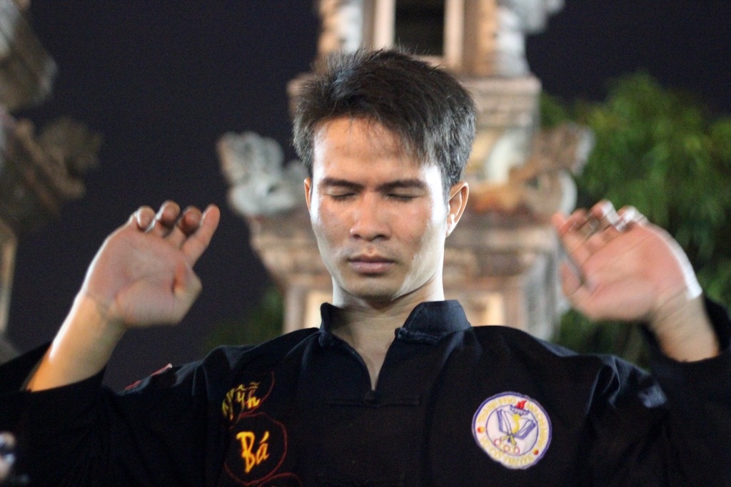 | Trước khi vận dụng "nhãn cốt công", võ sư Phi Ngọc Long phải vận khí. |