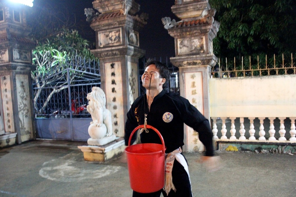| Hiện tại, khả năng tới hạn của Ngọc là nâng đươc xô nước năng 10 kg. "Để thực hiện khả năng này, tôi phải mất 6 năm ròng tập luyện. Hiện nay, ở Việt Nam cũng chỉ có khoảng 4 người làm được kỹ năng này", anh cho biết. |