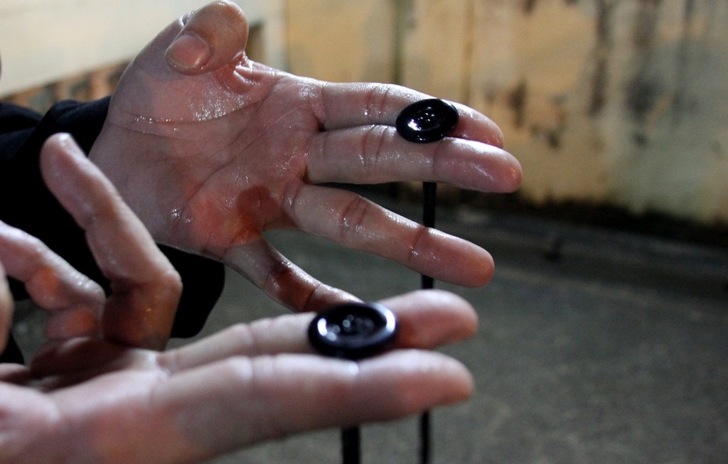 | Vật dụng để kết nối mí mắt với xô nước là một đồng xu nhỏ bằng sắt, có xỏ dây. |