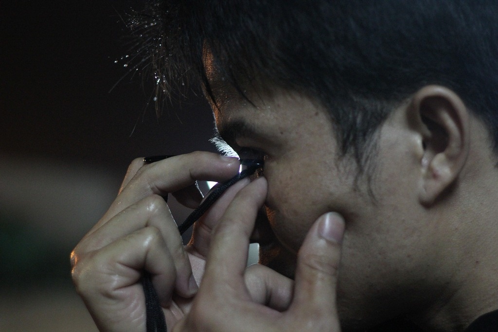 | Sau khi vận khí xong, hai đồng xu nhỏ được cho vào hai bên mắt. |
