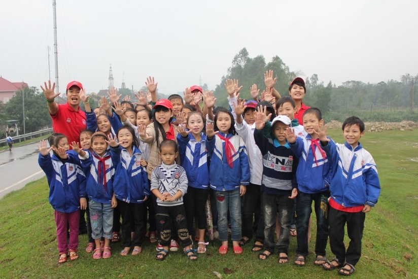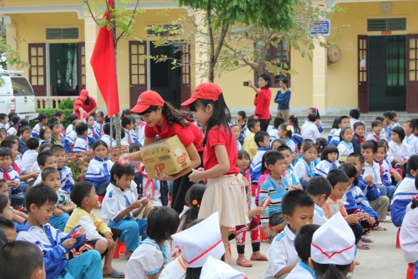 Thu Hà còn cùng các anh chị tình nguyện phát quà cho các bạn nhỏ ở trường tiểu học Diễn Hoa, xã Hưng Châu, Nghệ An.