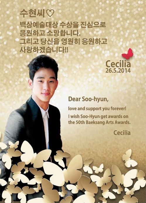 Báo giới Hong Kong cho biết, một người phụ nữ có tên Cecilia - được khẳng định là vợ của một tỷ phú xứ Cảng thơm - đã bỏ ra số tiền lên tới 40 triệu won (khoảng 800 triệu đồng), mua quảng cáo toàn trang của một tờ báo Hàn Quốc để đăng lời nhắn: "Soo Hyun thân mến, yêu và ủng hộ anh mãi mãi! Hy vọng anh sẽ giành giải thưởng tại lễ trao giải Baeksang lần thứ 50. Ký tên: Cecilia".