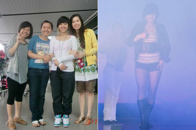 | Suni Hạ Linh (áo trắng ảnh trái) thời điểm nặng 58 kg. |