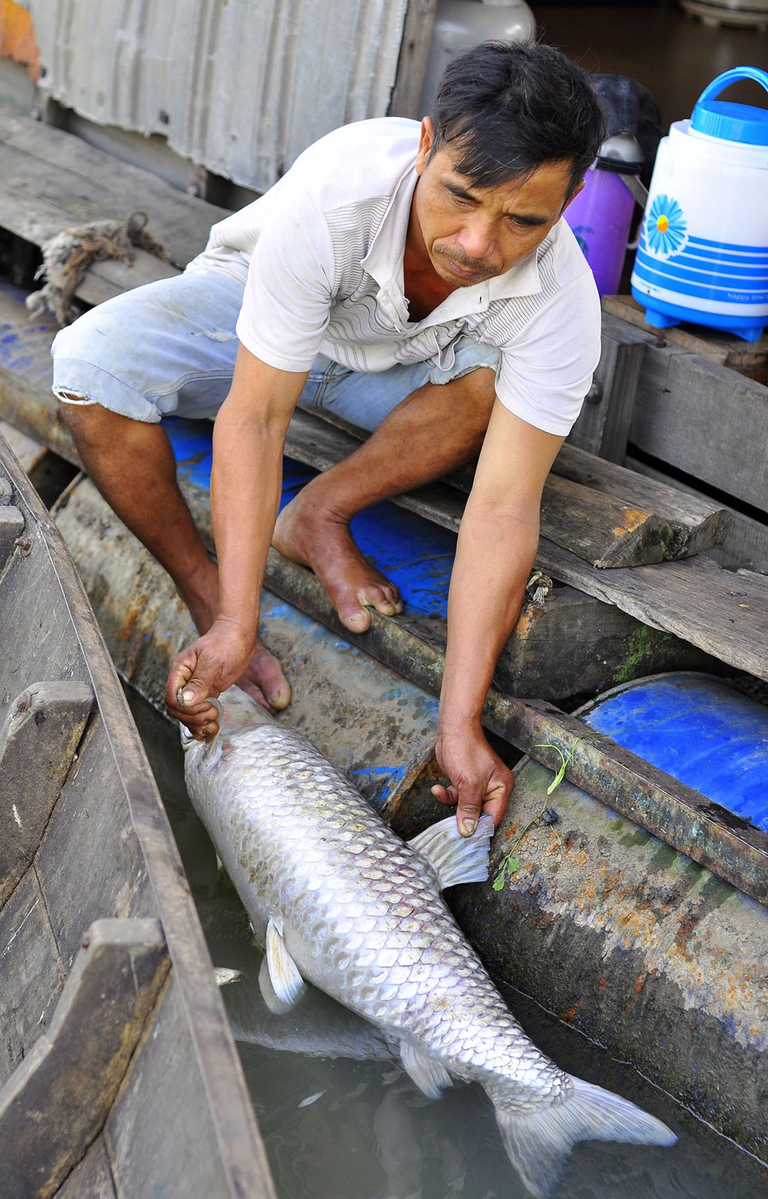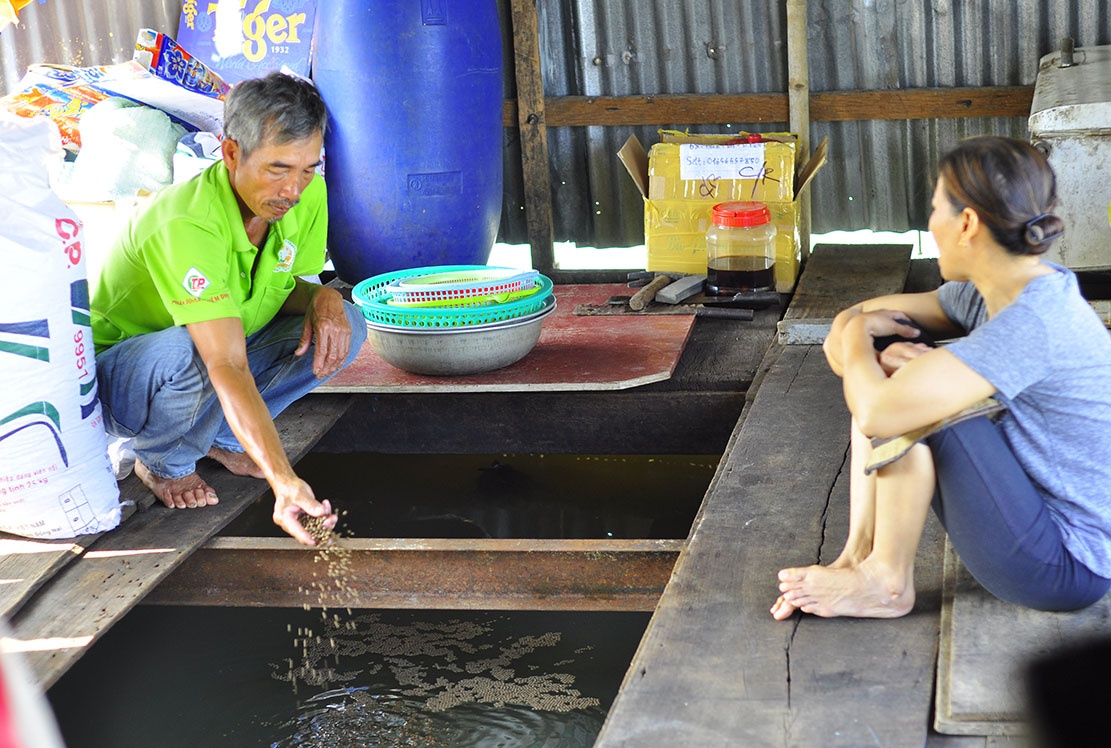 | Ông Dương ném thức ăn xuống bè kiểm tra lượng cá còn lại, nhưng không thấy con nào nổi lên. |