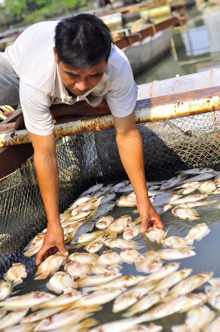| Trong 2 ngày, ông Dương cùng những người trong gia đình vớt gần 15 tấn đem đi thiêu hủy. Ông buồn rầu: "Thế này thì Tết năm nay tay trắng rồi. Trong bè còn khoảng 200 kg cá còn sống nhưng cũng đang có biểu hiện đuối sức, chết dần". |