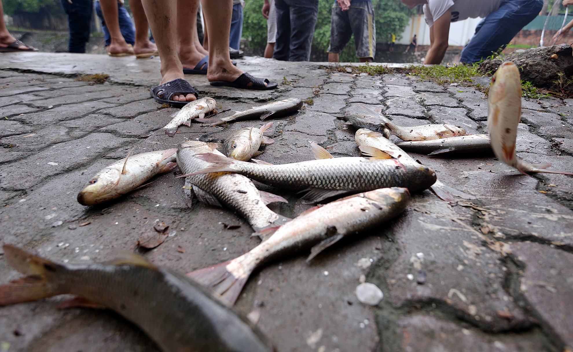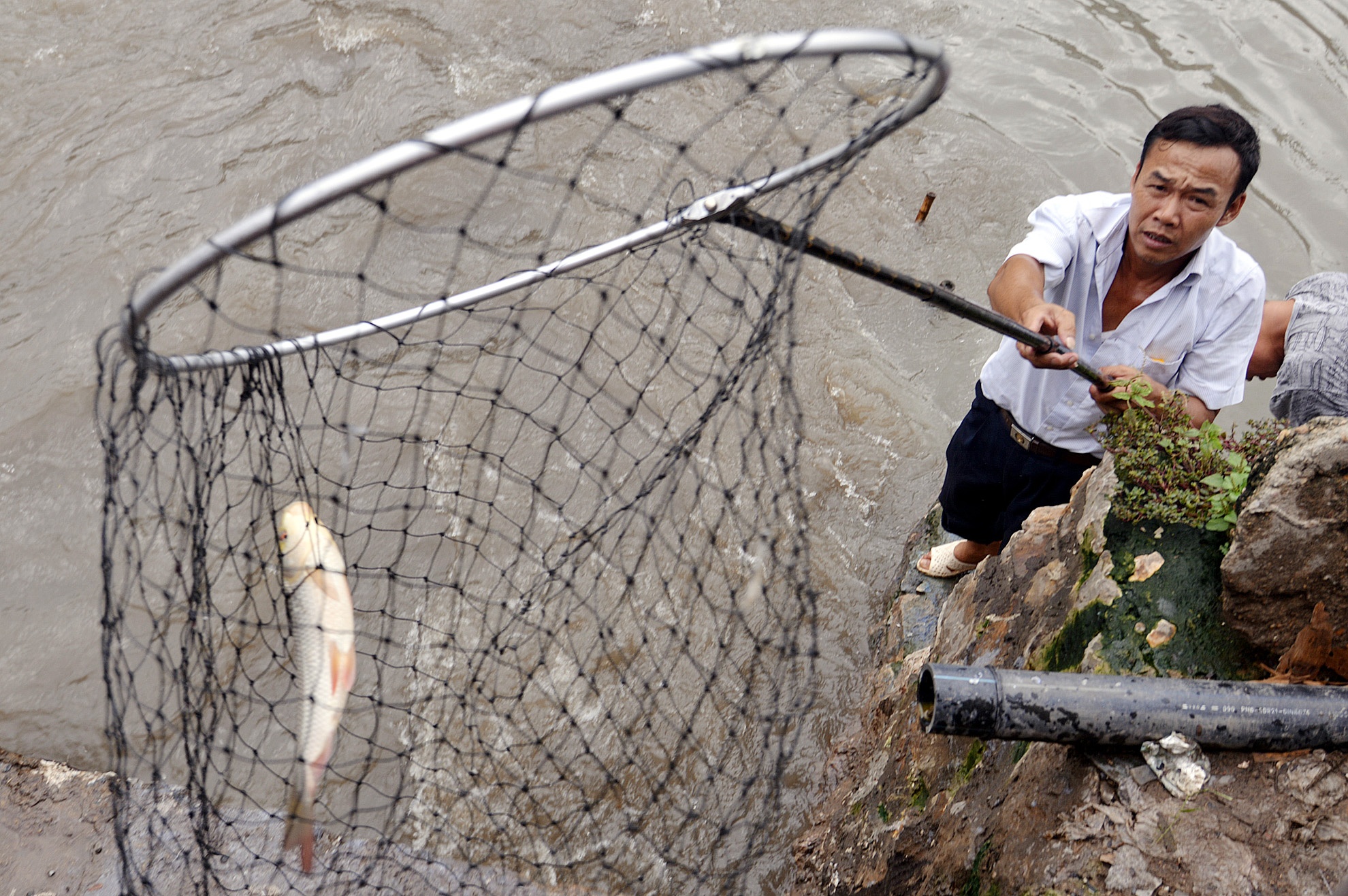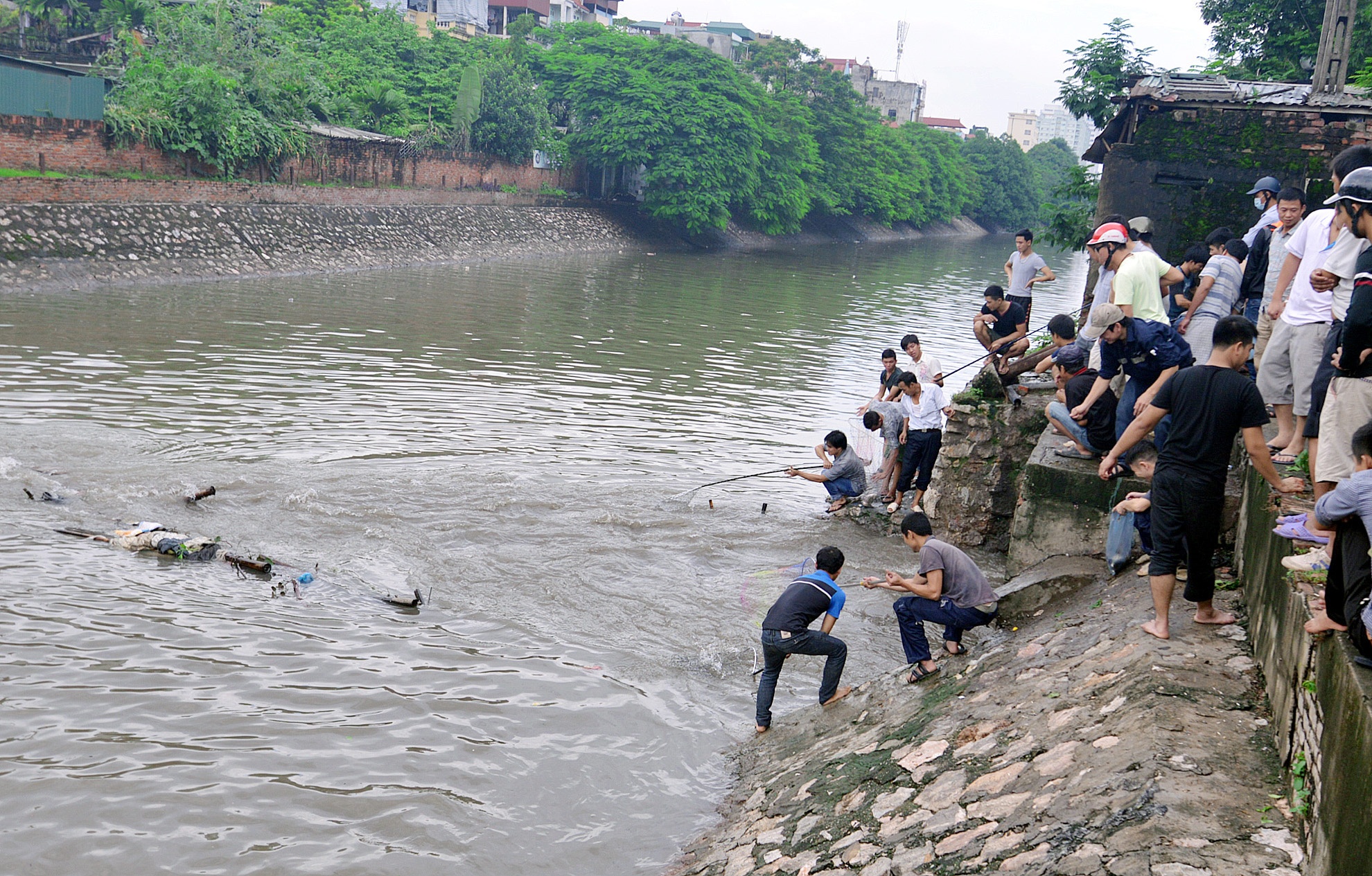 Trận mưa lớn vào đêm 21/9, rạng sáng 22/9 đã làm nước dâng cao. Cá từ các ao hồ tràn ra sông Kim Ngưu, quận Hoàng Mai (Hà Nội). Trưa nay, nhiều thanh niên đã tranh thủ đánh bắt, có người thu được hàng chục kg cá.