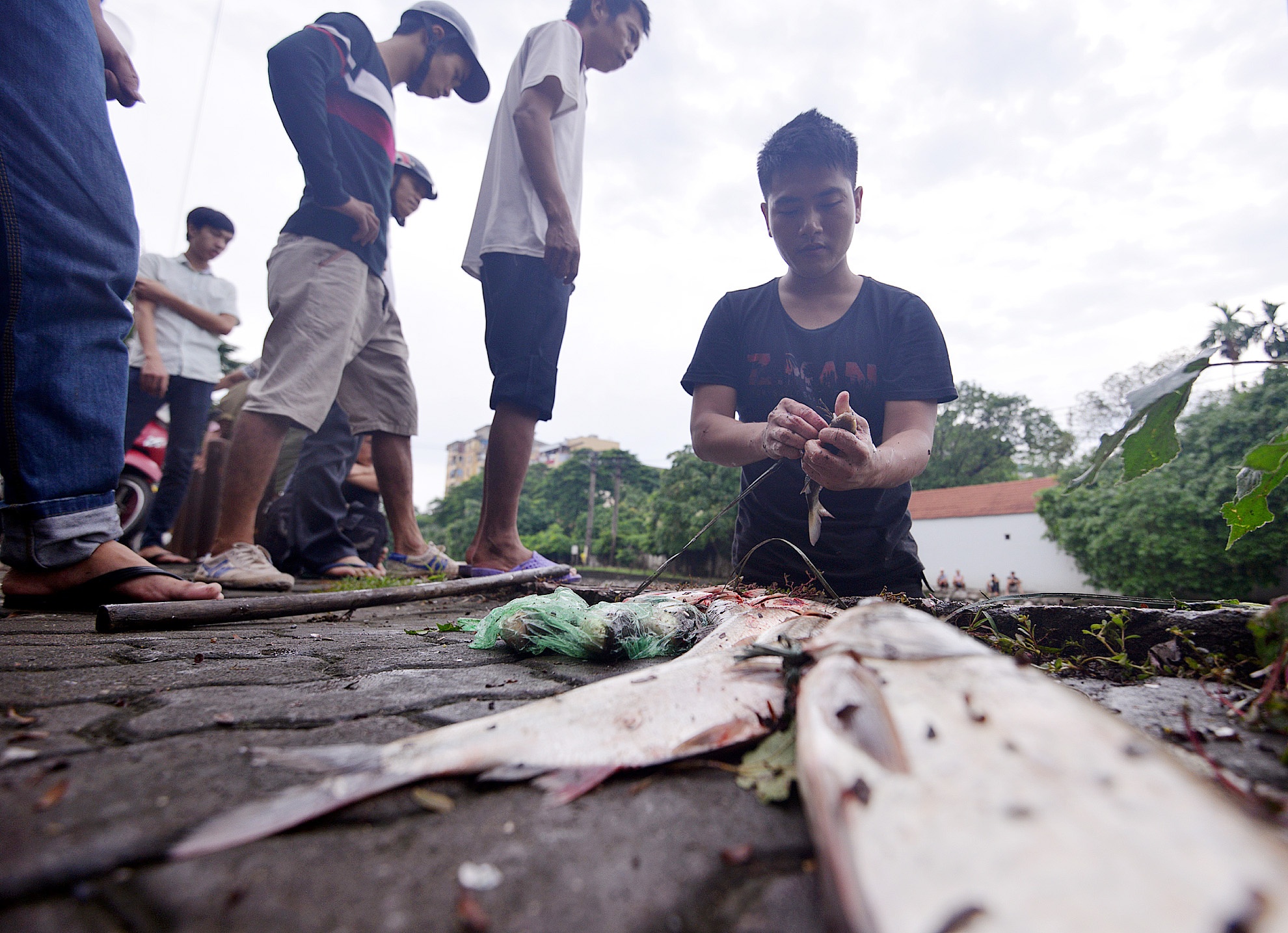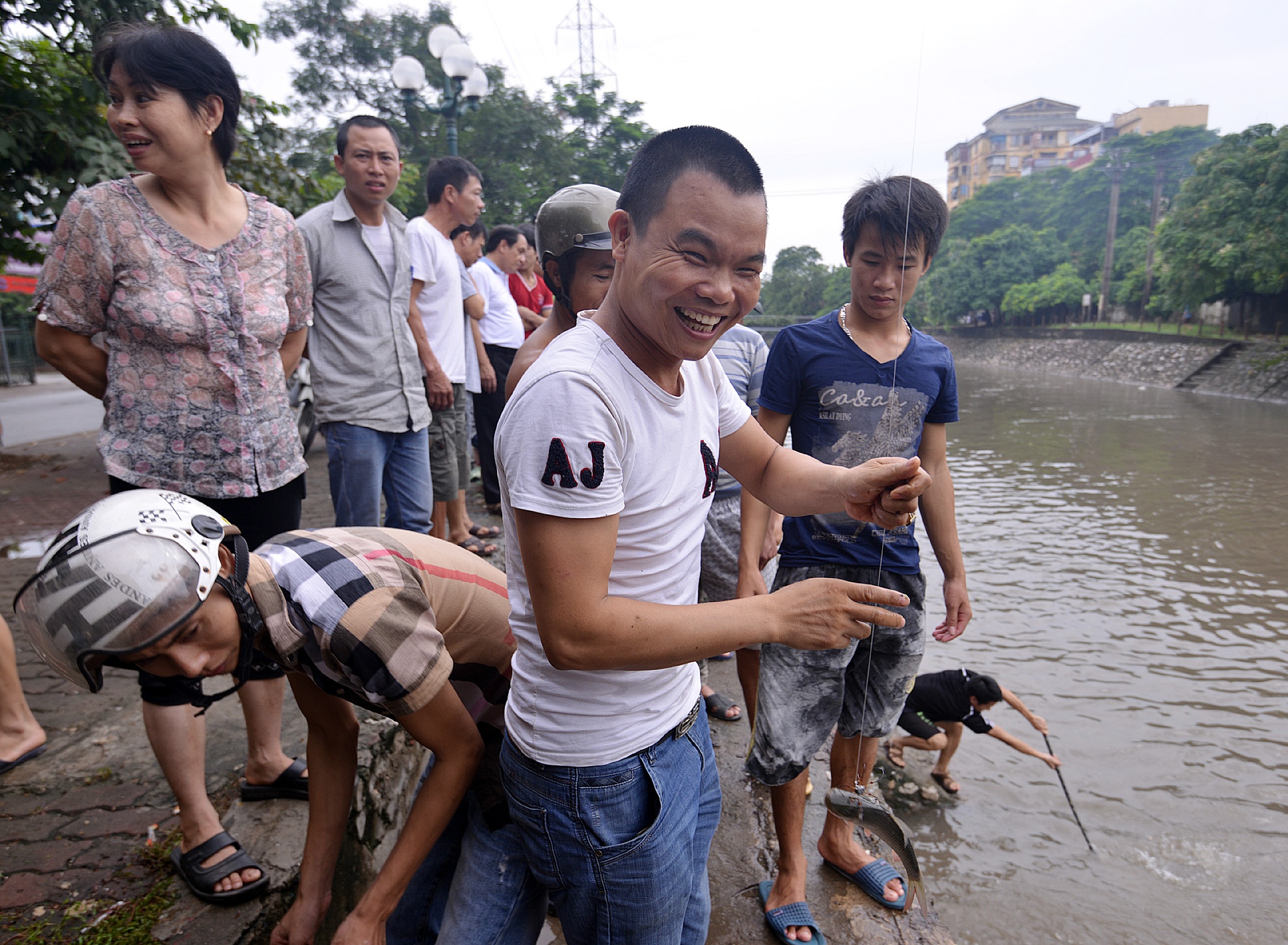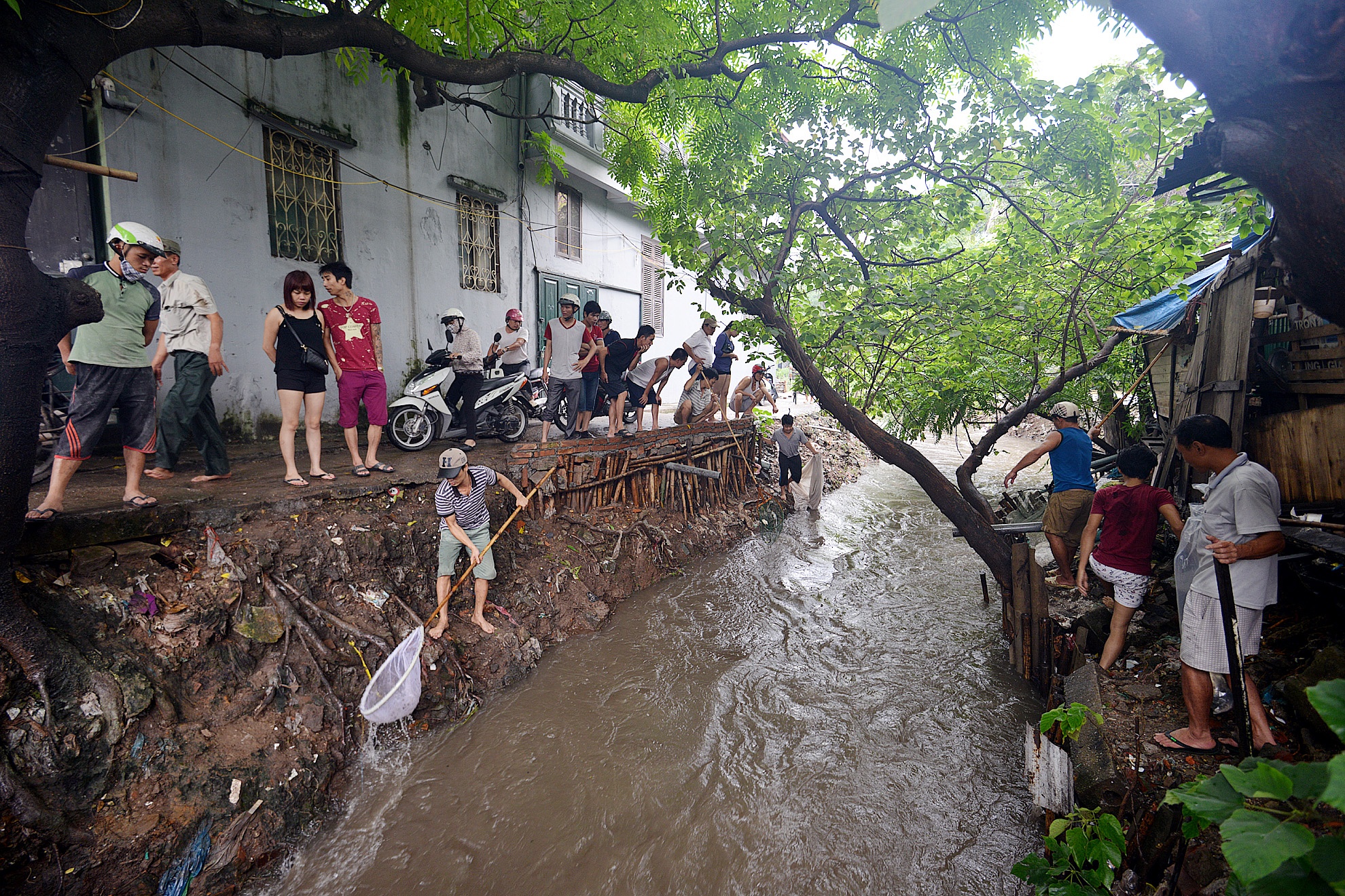 Trận mưa lớn rạng sáng 22/9 khiến cho đường phố thủ đô ngập kèm theo cá từ ao hồ tràn về sông Kim Ngưu. Nhiều thanh niên tranh thủ mang vợt ra múc, chỉ ít phút đầy xô.