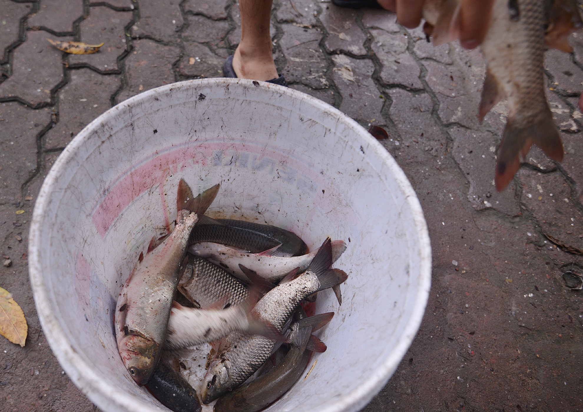 Cá nhiều đến mức người dân vứt đầy vỉa hè đường Tam Trinh, quận Hoàng Mai.