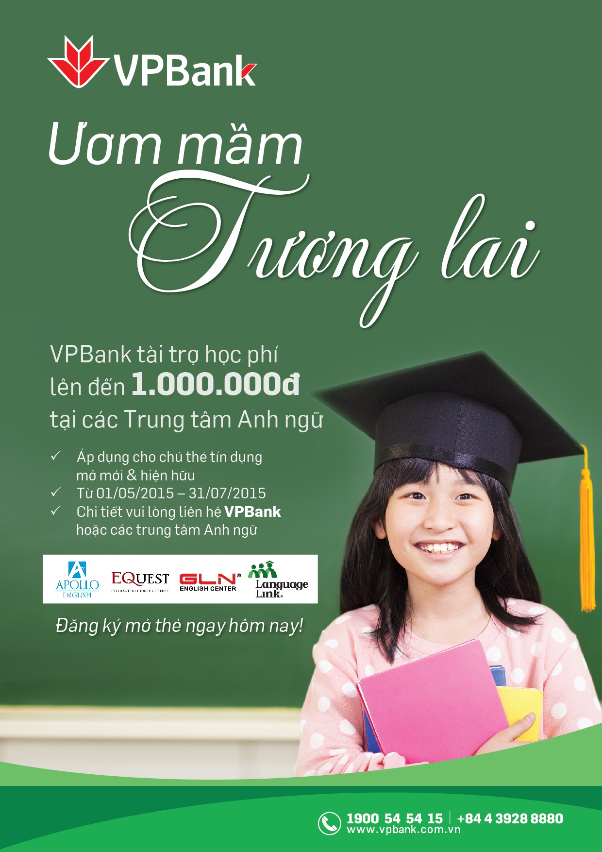 Mỗi tháng, VPBank sẽ dành tặng tiền mặt giá trị 1 triệu đồng vào tài khoản 10 chủ thẻ tín dụng mở mới và 500.000 đồng vào tài khoản 140 chủ thẻ tiếp theo nếu khách hàng có phát sinh giao dịch tại các trung tâm Anh ngữ tham gia chương trình bao gồm Apollo, Langugage Link, Equest, GLN và JOLO.