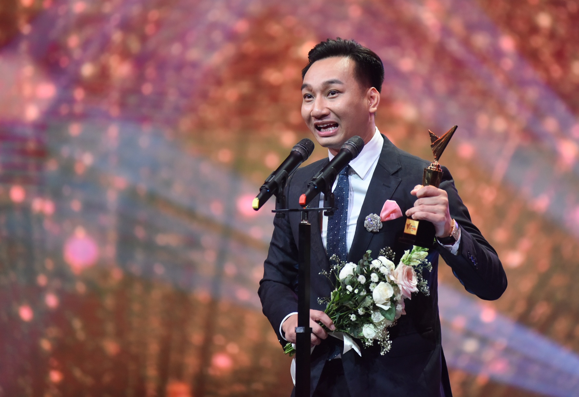| Thành Trung được xướng tên ở hạng mục Dẫn chương trình ấn tượng. Những đề cử khác ở hạng mục này gồm Xuân Bắc (Ơn giời cậu đây rồi), Thụy Vân (Chuyển động 24h), Phí Thùy Linh (Muôn màu showbiz). Ảnh: Việt Hùng. |