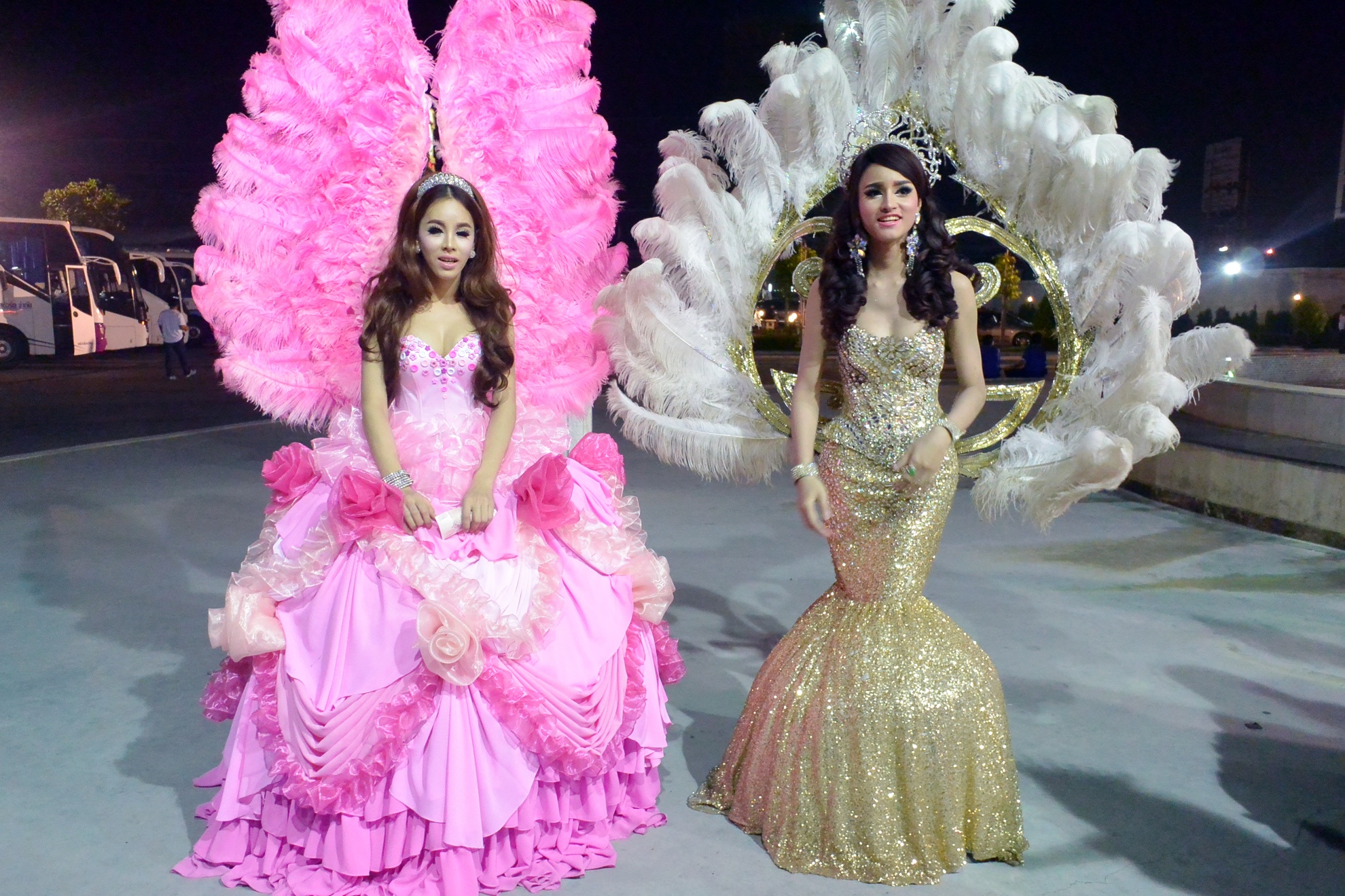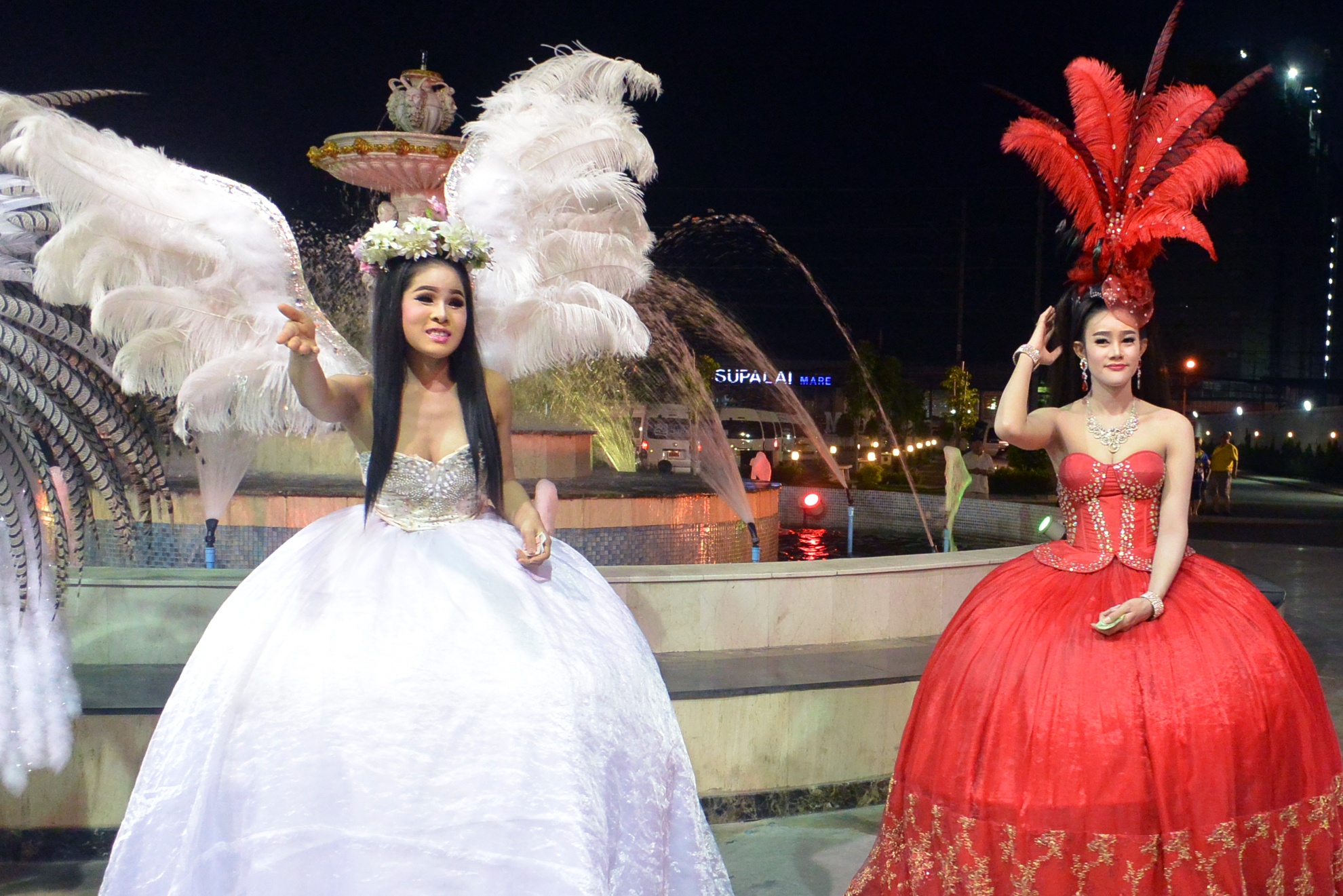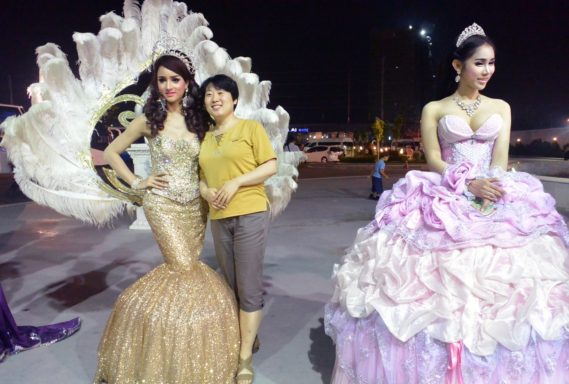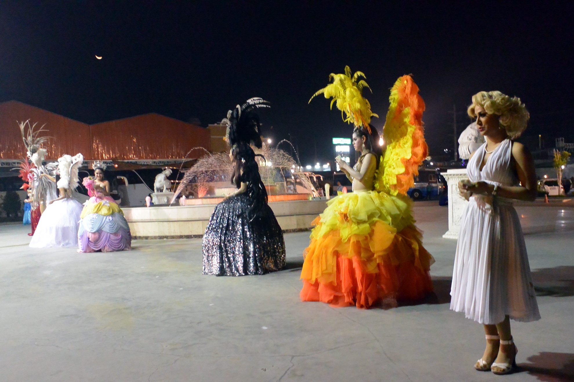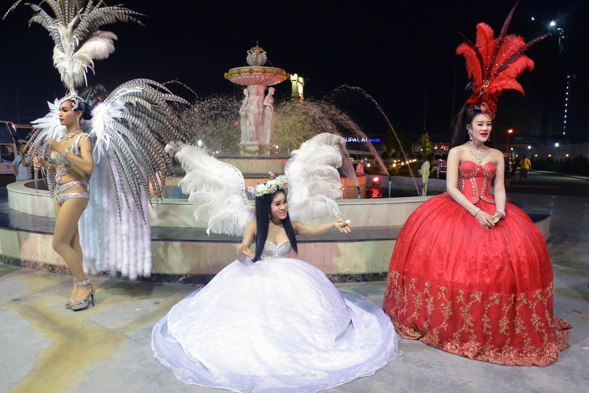 | Các vũ công chuyển giới đứng chờ khách chụp ảnh cùng tại sân quảng trường nhà hát Colosseum Show Pattaya (Thái Lan) sau buổi biểu diễn. |