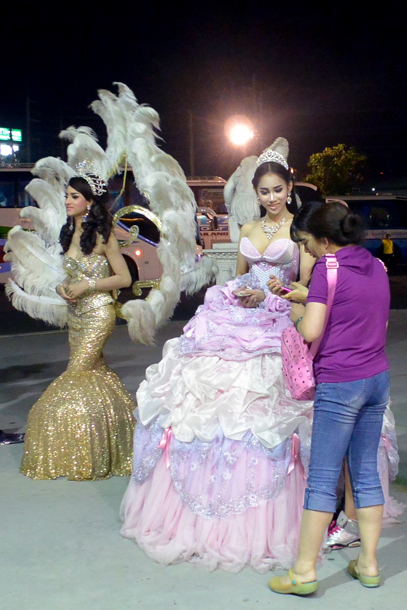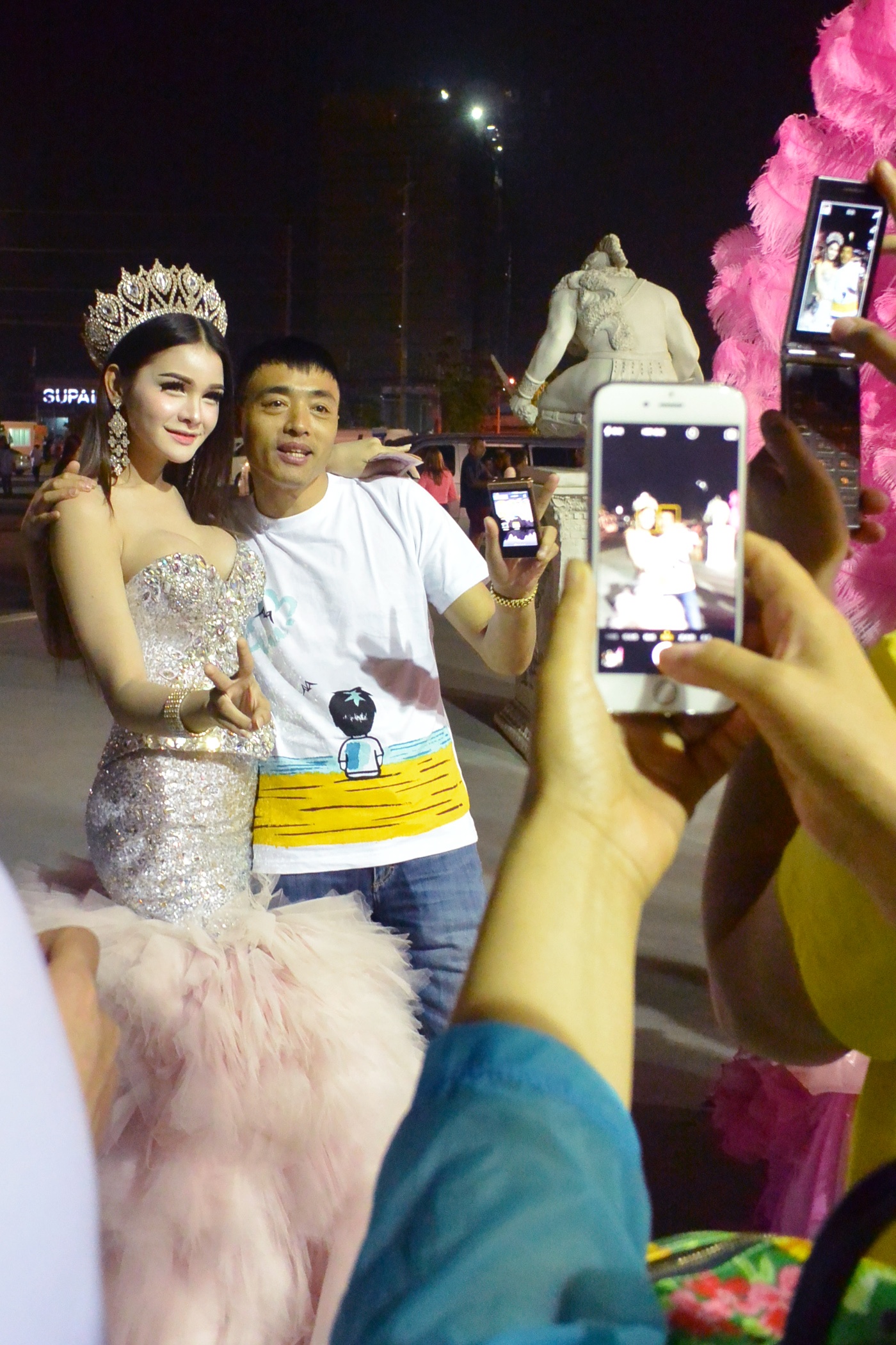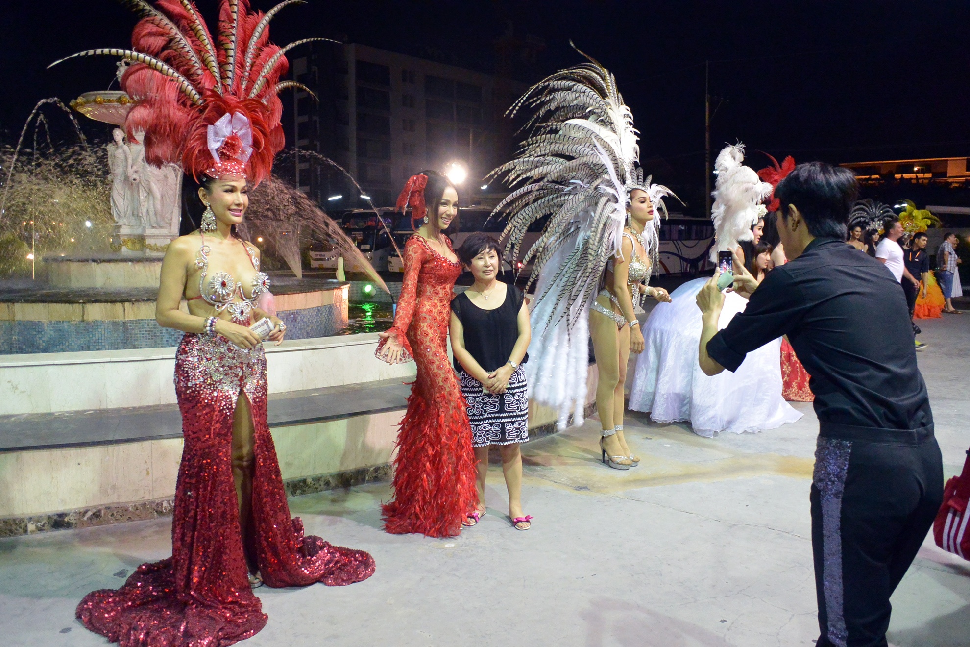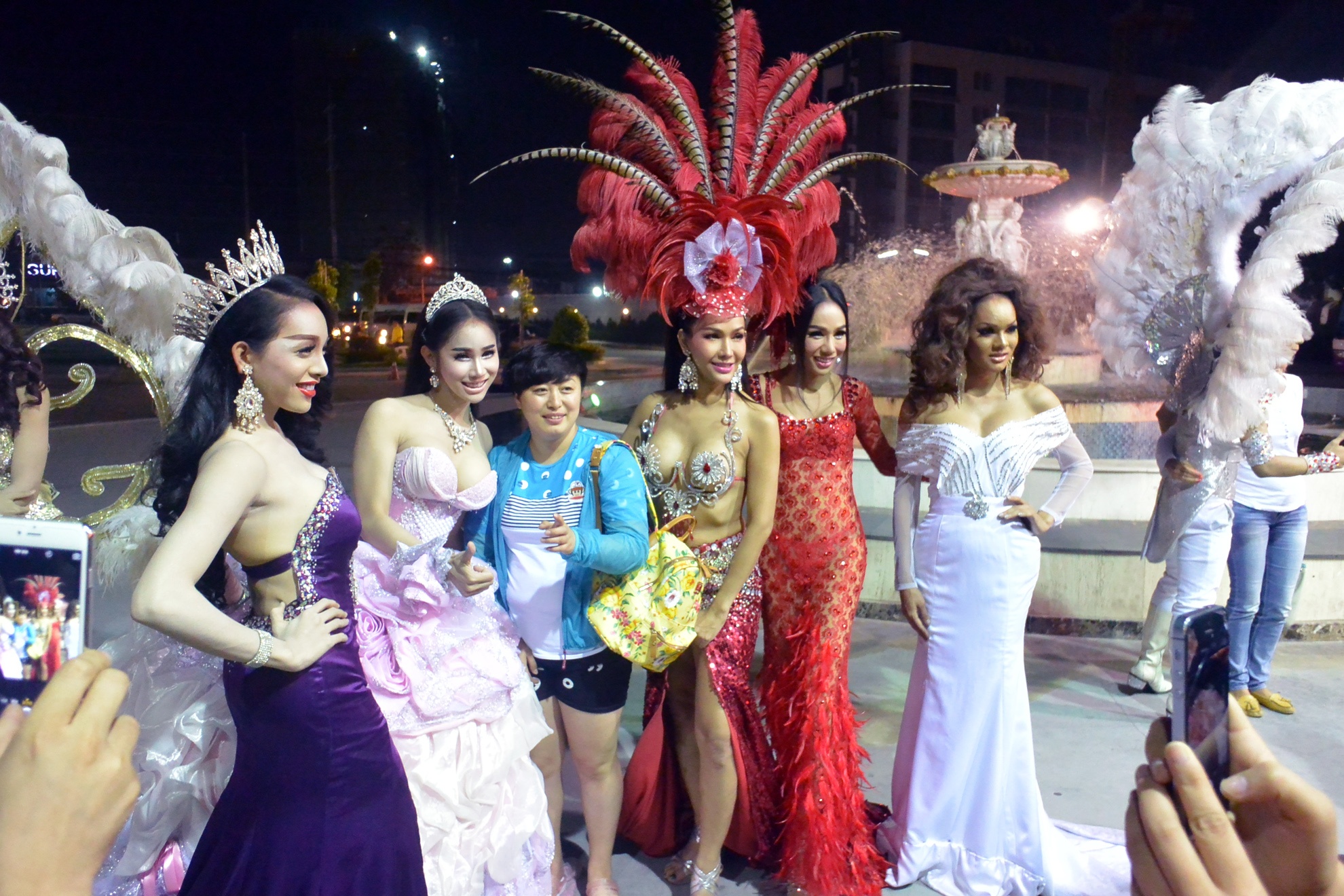 | Sau ít phút ngần ngại nhiều du khách đã mạnh dạn hơn và đứng vào giữa các cô gái chuyển giới để chụp ảnh. Họ phải bo cho mỗi người đẹp ít nhất 40 baht trở lên. |