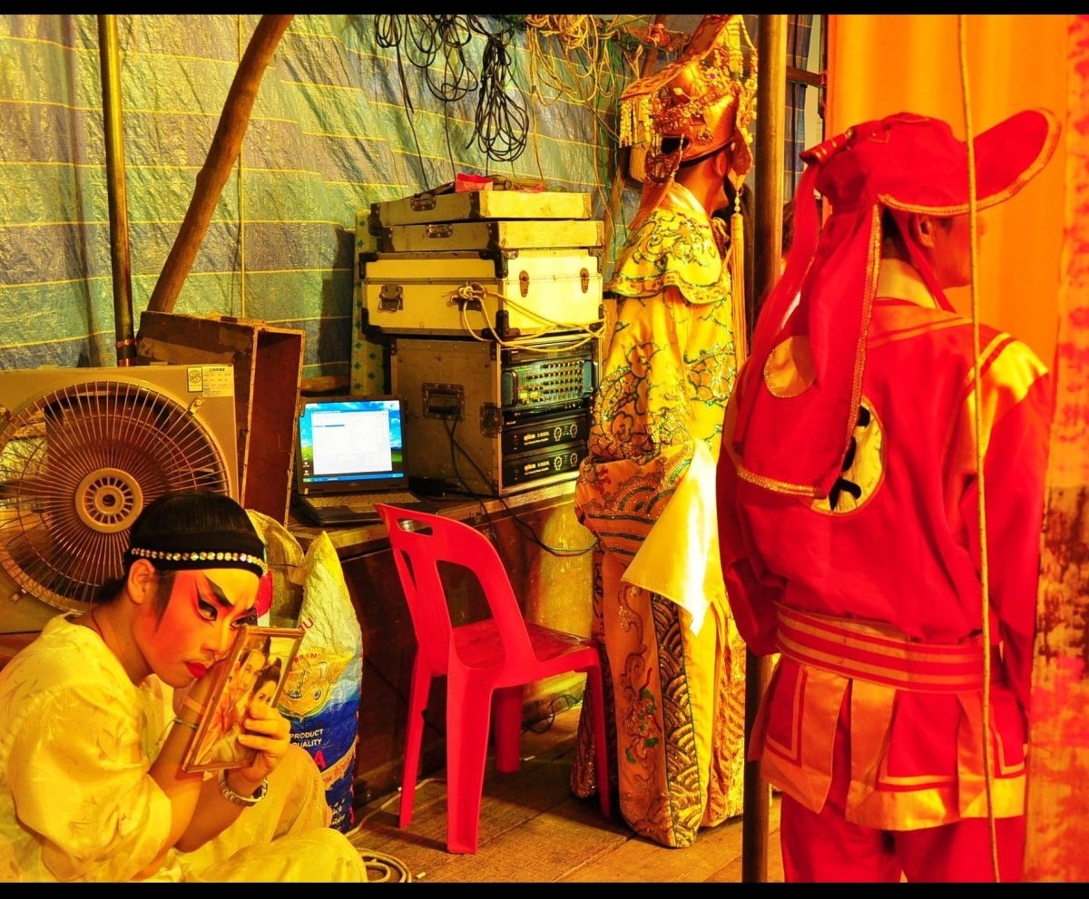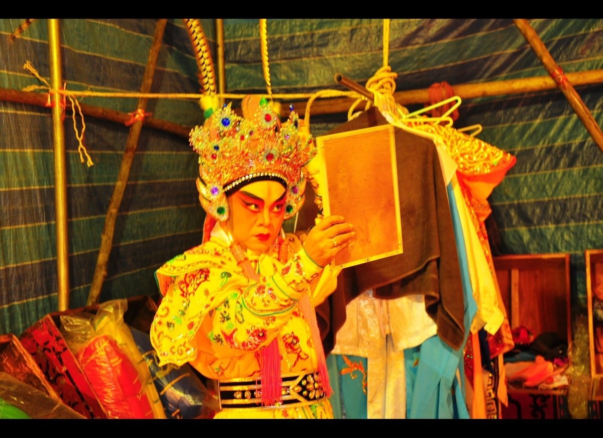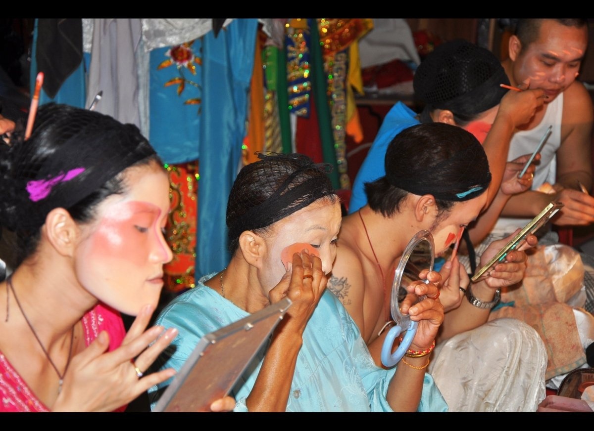 Người biểu diễn trang điểm trước khi lên sân khấu.
