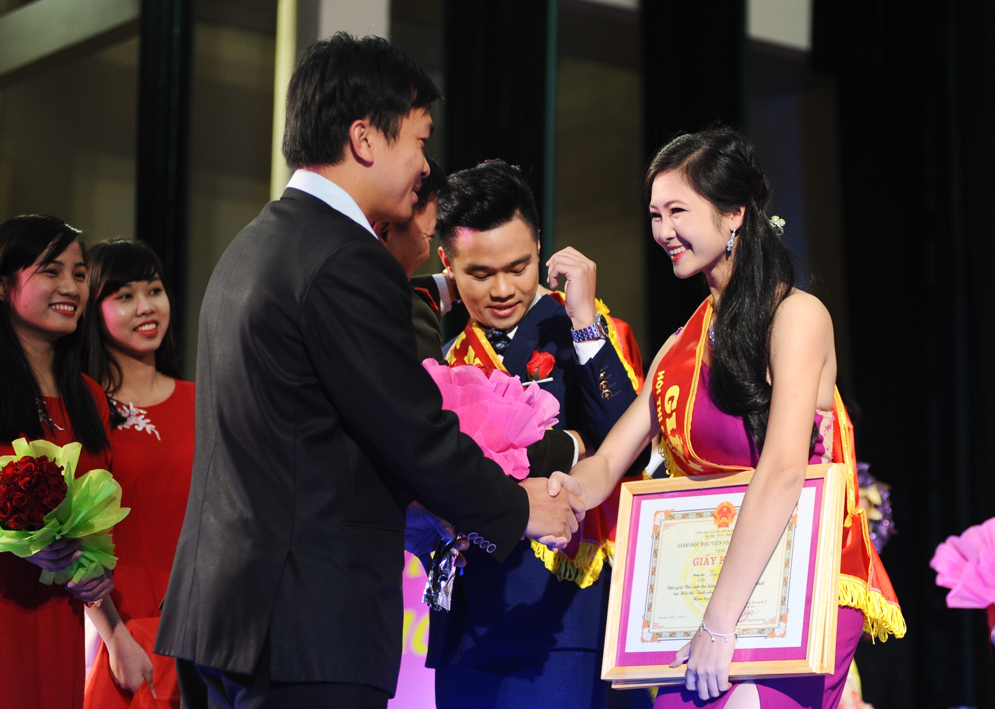 | Tân Hoa khôi Học viện An ninh Nhân dân vui mừng đón nhận thành tích từ ban lãnh đạo trường. |