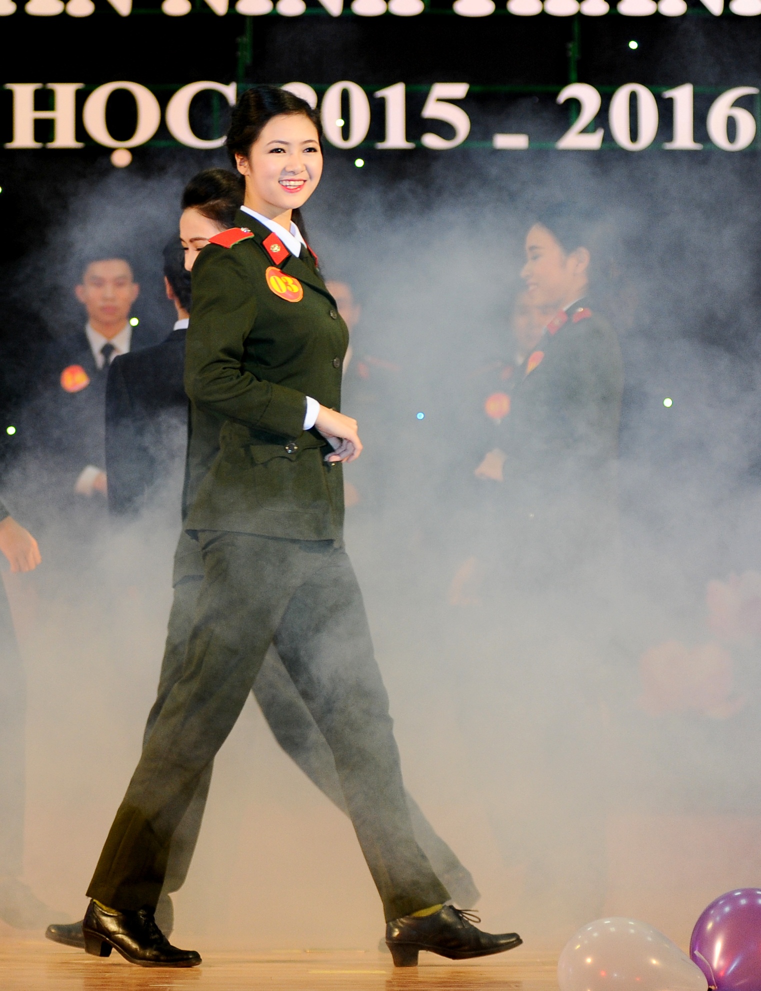 | Ở phần thi trang phục bắt buộc - trang phục ngành - nữ sinh tự tin sải bước, đem lại sự uyển chuyển, dịu dàng dù khoác lên mình bộ quân phục. |
