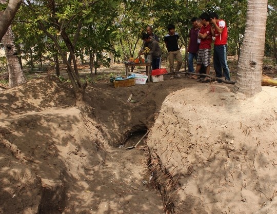 | Hố đất của gia đình ông Xê, nơi phát hiện các hài cốt chôn tập thể. |
