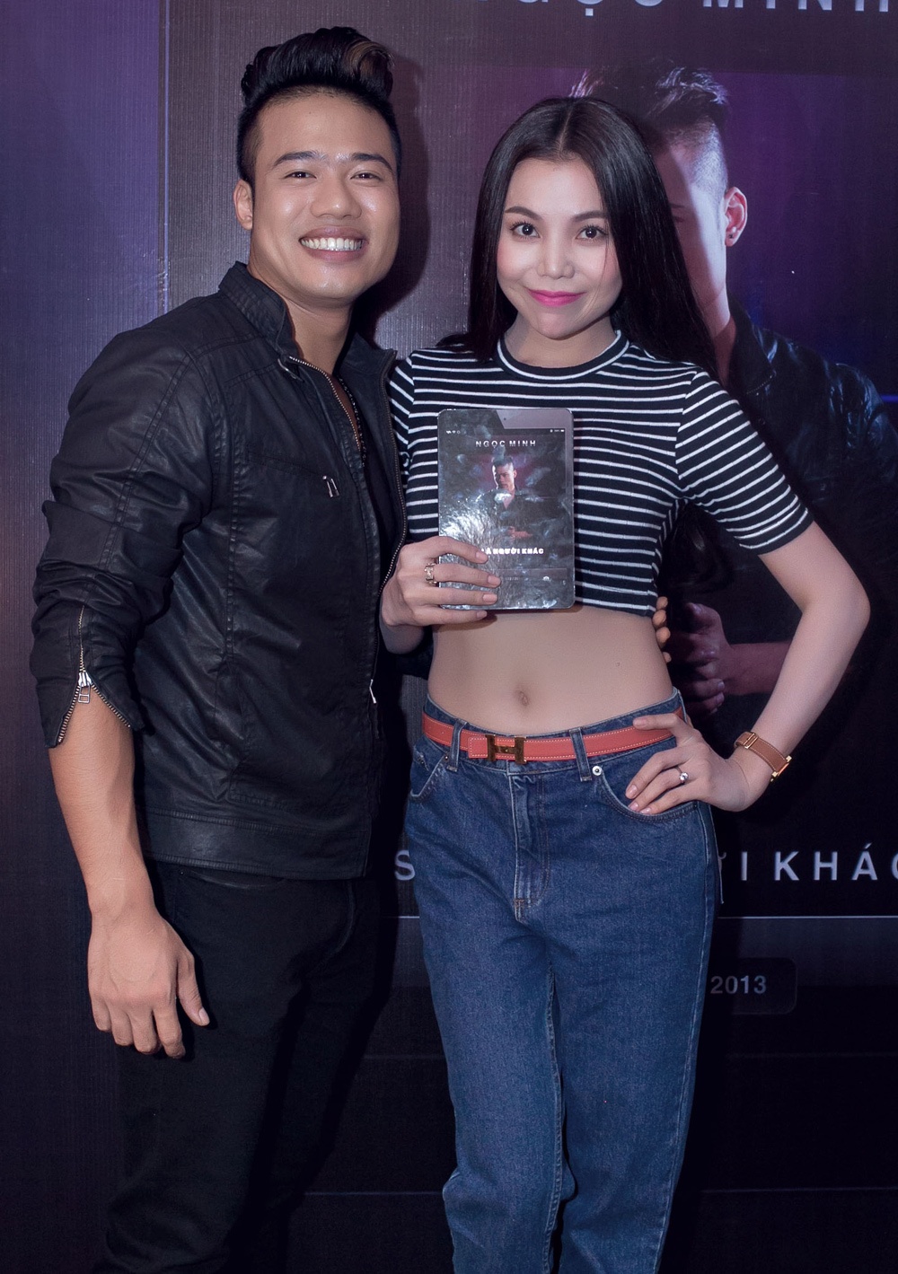 | Cả hai chụp hình "nhí nhố"" trước buổi họp báo. Ngọc Minh cũng nhận được rất nhiều câu hỏi từ phía báo chí trong buổi họp báo. Đặc biệt khi được hỏi về nội dung của MV Sẽ là người khác, có liên quan đến mối tình “gây giông bão” xưa kia với thí sinh The Voice Hà Linh. Ngọc Minh vẫn rất tự tin trả lời nhưng đầy ẩn ý và cho rằng đây là câu chuyện của anh và nhạc sĩ Khắc Việt giấu kín như lời hứa ban đầu khi cả hai bắt đầu lên ý tưởng. |