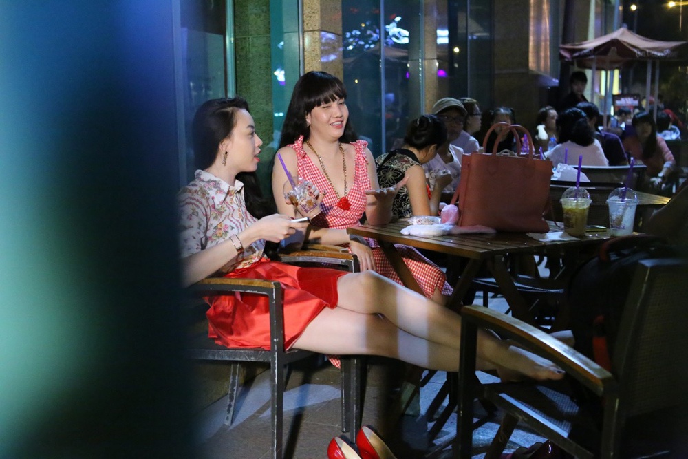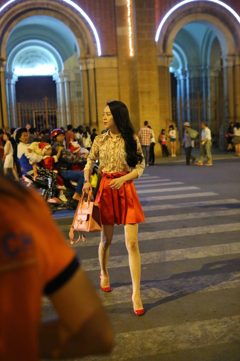 | Hoàng Điệp đến Nhà thi đấu Nguyễn Du để hẹn bạn xem phim. Cô diện chiếc váy màu đỏ và áo sơmi kín đáo khác hẳn với hình ảnh gợi cảm trước kia của cô. |