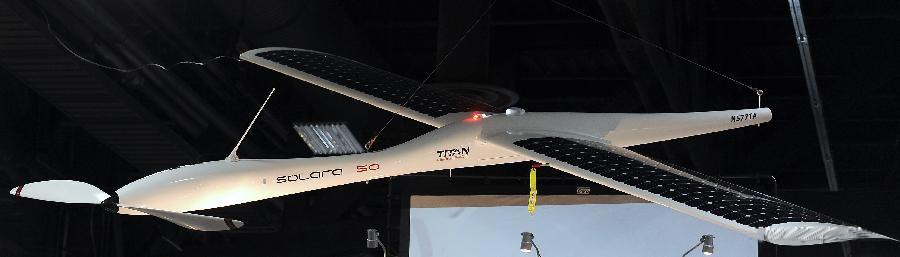 | Máy bay không người lái sử dụng năng lượng mặt trời Solara 50 của Titan Aerospace. Những tấm pin mặt trời chuyên dụng trên sải cánh dài cùng hệ thông lưu trữ năng lượng bên trong giúp Solara 50 có thể bay trong điều kiện không có ánh nắng. |