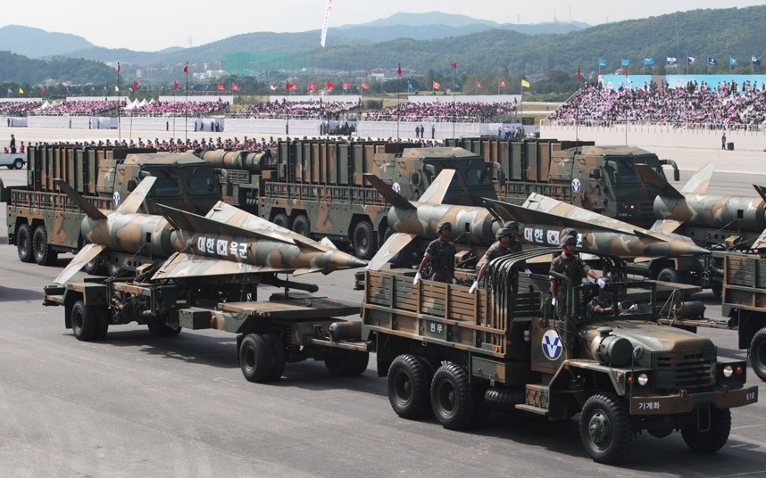 Trong khuôn khổ lễ diễu hành, Hàn Quốc lần đầu công khai loại tên lửa đạn đạo dẫn đường bằng hệ thống định vị toàn cầu (GPS) Hyunmu-3. Tên lửa đạn đạo này sở hữu tầm bắn lên tới 1.000 km, đủ sức tấn công các mục tiêu trên đất Triều Tiên. Hyunmu-3 do Hàn Quốc tự nghiên cứu chế tạo trong nhiều năm trở lại đây. Ảnh: AP. |