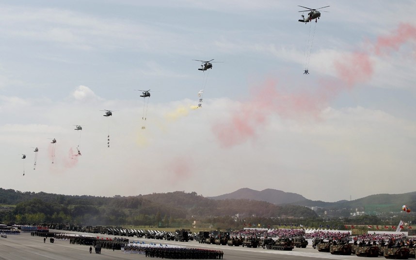 Lính đặc nhiệm Hàn Quốc treo mình trên trực thăng, bay trên đoàn diễu hành. Lực lượng đặc nhiệm là một trong những phần quan trọng của quân đội Hàn Quốc, với nhiệm vụ phản ứng nhanh và linh hoạt trong mọi tình huống. Ảnh: Reuters. |