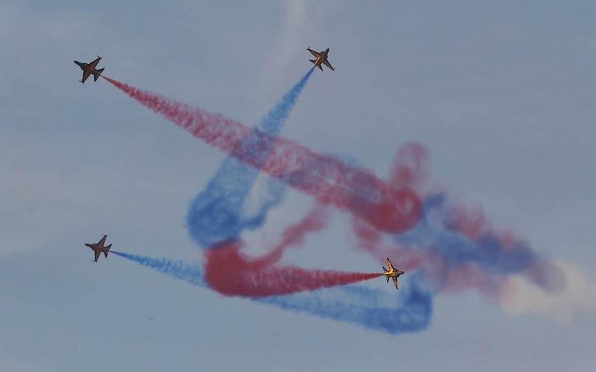 Phi đội trình diễn Đại Bàng Đen của không quân Hàn Quốc chao liệng trên bầu trời thủ đô Seoul trong khuôn khổ lễ diễu hành. Ảnh: Getty Images. |