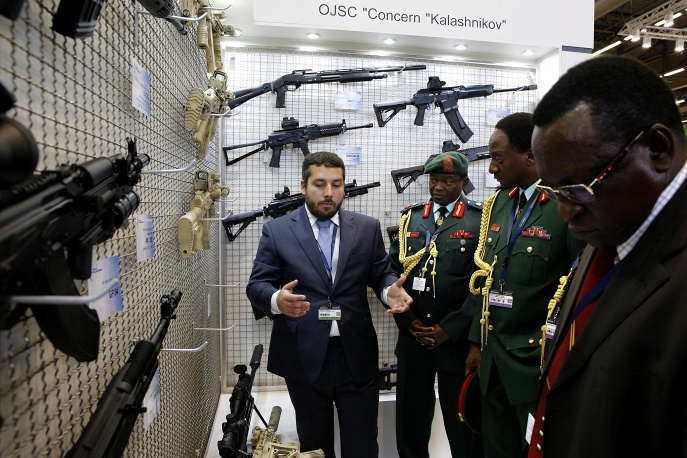 Đại diện công ty súng trường Kalashnikov (Nga) đang giới thiệu về các mẫu súng mới với phái đoàn quân đội Tanzania. |