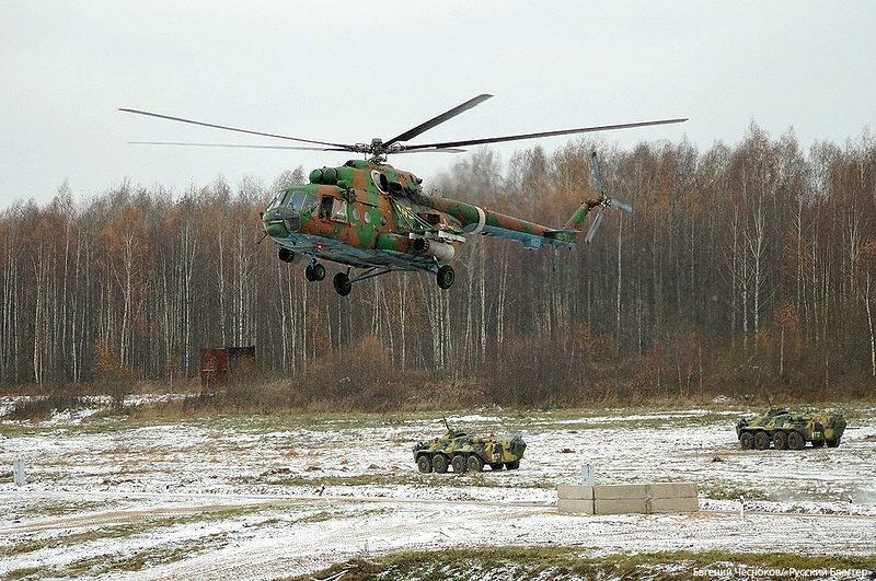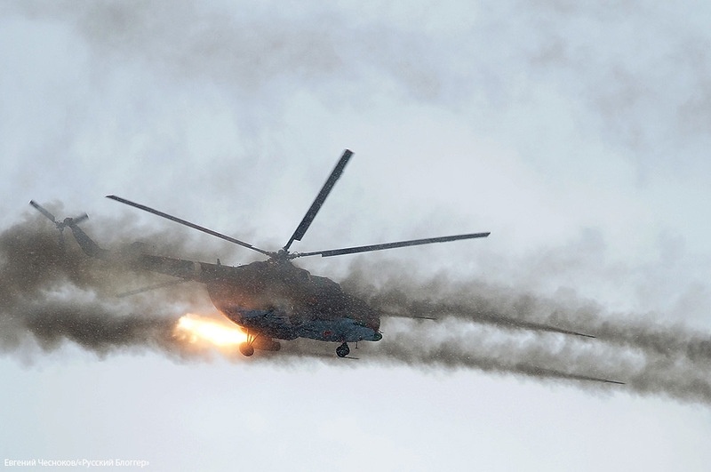 | Trực thăng vũ trang nã đạn vào mục tiêu trong một bài tập tại trung tâm đào tạo cảnh sát đặc nhiệm Moscow. |