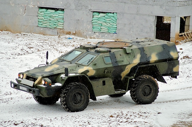 Xe bọc thép chuyên dụng hoạt động gần khu nhà được xây dựng phục vụ yêu cầu huấn luyện. |