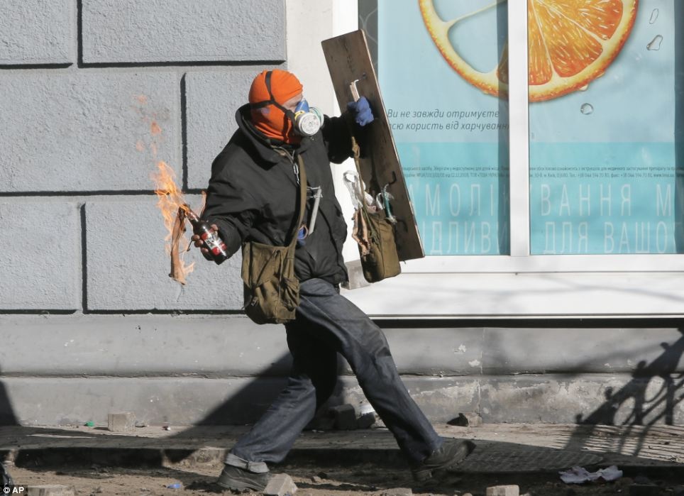 Bom xăng đã trở thành vũ khí khá phổ biến trong các cuộc bạo động chống chính phủ tại Ukraina. Ảnh: AP.