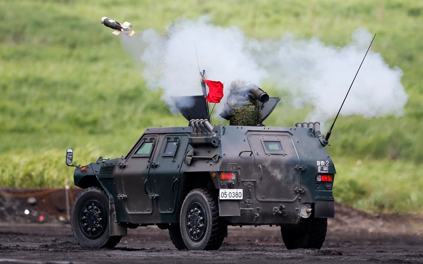 Binh sĩ nã tên lửa chống tăng vác vai từ trên nóc một chiếc xe quân sự. Giới chức Nhật Bản cho biết, cuộc tập trận nhằm đẩy lùi đợt tấn công giả định vào các hòn đảo xa xôi của Nhật Bản. Ảnh: Reuters