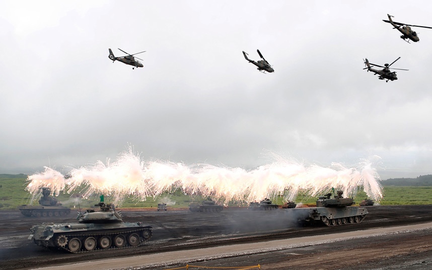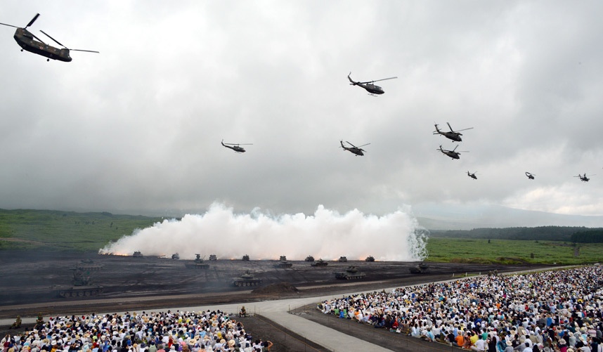 Hàng chục ngàn người tới theo dõi cuộc tập trận bắn đạn thật quy mô lớn của Lực lượng Phòng vệ Nhật Bản. Ảnh: Getty