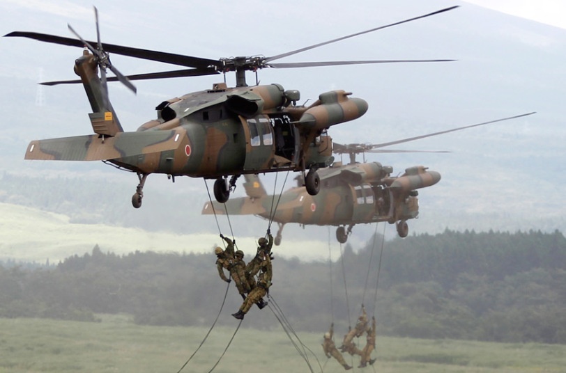Binh sĩ Nhật Bản tập trận đổ bộ từ trực thăng đa nhiệm UH-60 Black Hawk. Ảnh: Reuters