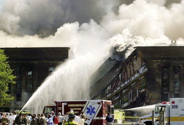 Trong khi nước Mỹ đang bàng hoàng về vụ tấn công khủng bố ở thành phố New York, chuyến bay số hiệu 77 của hãng American Airlines bị không tặc kiểm soát và lao xuống Lầu Năm Góc ở Arlington, bang Virginia lúc 9h37 phút theo giờ địa phương. Sự cố làm 59 hành khách, phi hành đoàn và những tên không tặc trên máy bay cùng 125 nhân viên làm việc tại trụ sở Bộ Quốc phòng Mỹ thiệt mạng. Ảnh: Getty