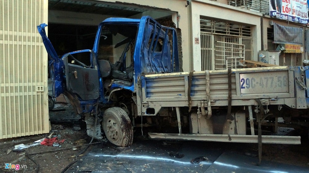 Sức ép vụ nổ mạnh đến mức một chiếc xe tải đi qua đường cũng bắn văng vào ngôi nhà số 26 tòa CT9. Tài xế là anh Đặng Cao Thủy. Ảnh: Tùng Lâm. |