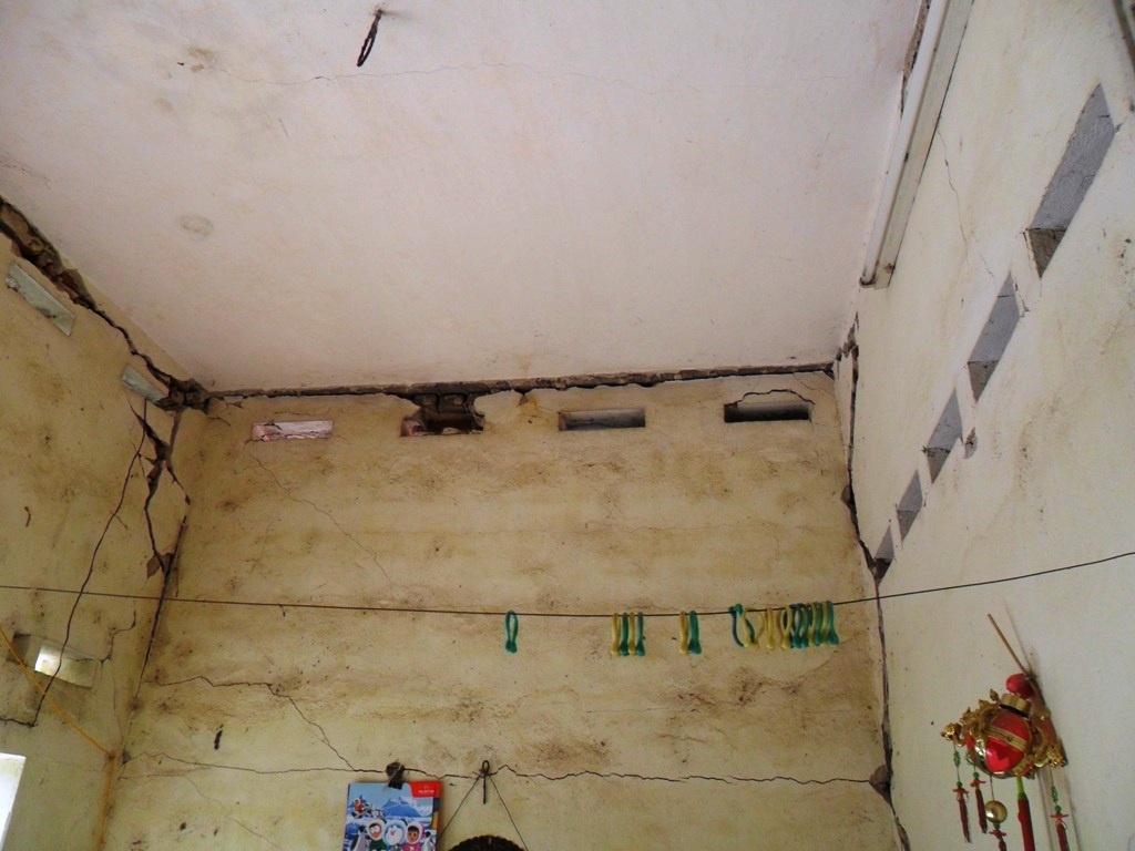 | Căn phòng học của con anh Trường được đổ mái bê tông kiên cố, nhưng do nằm ở phía vụ nổ xảy ra nên cũng đã nứt toác, có cảm giác như sẽ sập bất cứ lúc nào. |