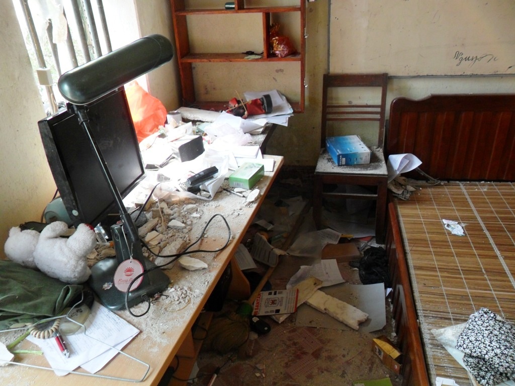 | Căn phòng học của con anh Trường vẫn còn ngổn ngang mảnh tường vỡ, rất may là cháu Huy, con anh Trường, không bị thương vong gì. |