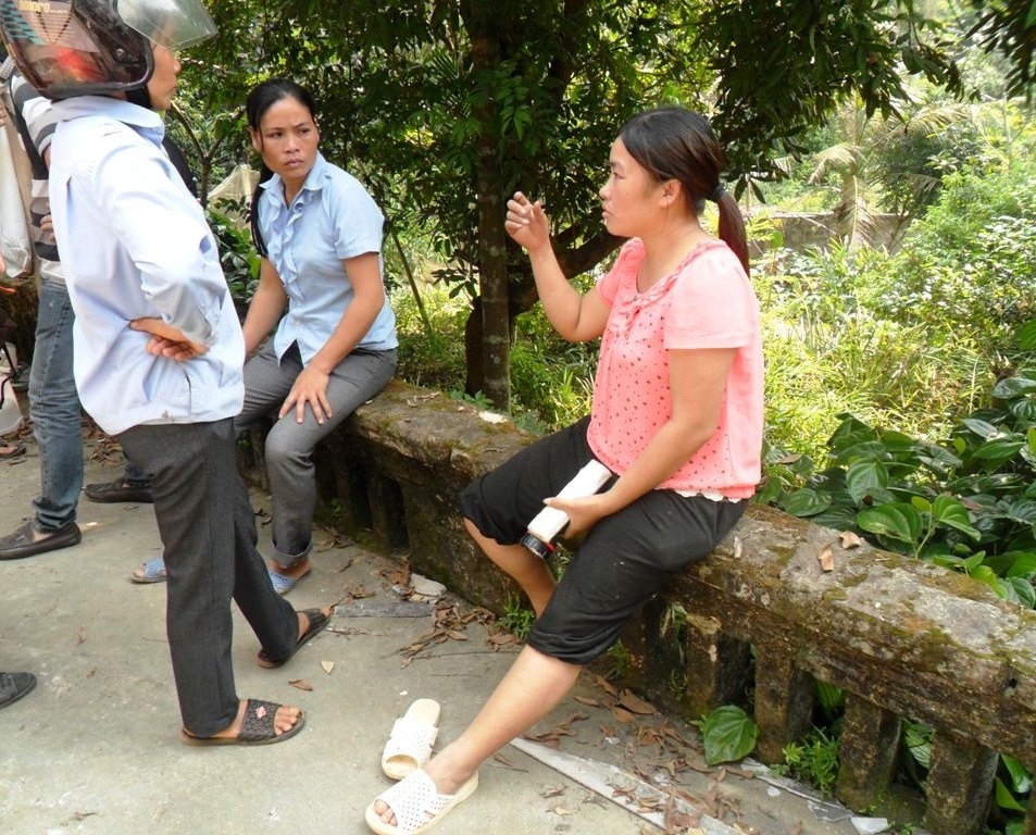 | Chị Hằng (áo hồng), con dâu bà Đáp, đang ngồi kể thời khác xảy ra vụ nổ. Chị nói khi đó ở nhà chỉ còn bà Đáp và hai đứa con chị, một cháu 2 tuổi, một cháu 10 tuổi. Nghe tin vụ nổ xảy ra, chị đã tức tốc đi xe máy từ cách hiện trường khoảng 5 km về đề đón con và mẹ. Chị Hằng nói giọng vẫn còn xúc động: "Khi nghe vụ nổ xảy ra, tôi đã vội vàng phi ngược dòng người di tản về nhà để đón mẹ già và 2 đứa con. Do ảnh hưởng của vụ nổ, chiếc xe của chị liên tục rung lên, có lúc chồm lên khỏi mặt đường và bị vỡ yếm xe, nhưng rất may là không bị ngã. Khi về đến nhà thì không thấy mẹ và hai con đâu". |