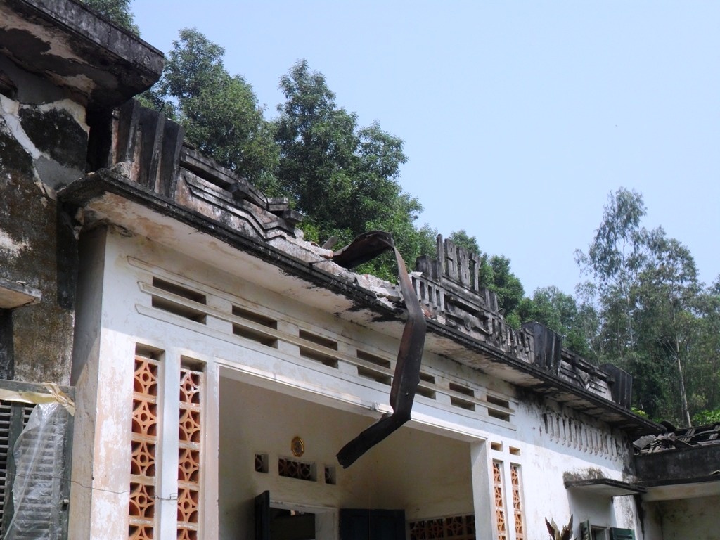 | Ngôi nhà của anh Nguyễn Đức Trường, nằm ngay tại mặt đường, phía đối diện nơi vụ nổ xảy ra. Gia đình anh Trường là một trong số nhiều ngôi nhà bị hư hại nặng nề quanh khu vực xảy ra vụ nổ thương tâm tại nhà máy pháo hoa - thuốc nổ tại xã Võ Lao, Thanh Ba, Phú Thọ. Trong hình là một thanh thép lớn, văng ra từ nhà máy khi vụ nổ xảy ra, vẫn còn nằm lại trên mái ngôi nhà. |