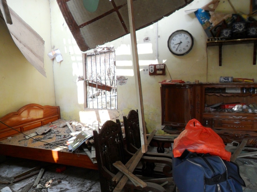 | Nhìn vào bên trong của căn nhà mới thấy hết sức công phá của vu nổ. Chị Hằng nói, bà Giáp kể lại rằng giữa khoảnh khắc sinh tử giữa sự sống và cái chết, bà như quên đi cái tuổi 75 để gắng sức bế cháu nhỏ chạy lên ngọn đồi gần nhà để lánh nạn. Sau khi về được đến nơi an toàn, bà cũng chỉ thấy nhức mỏi ở hai đầu gối. |