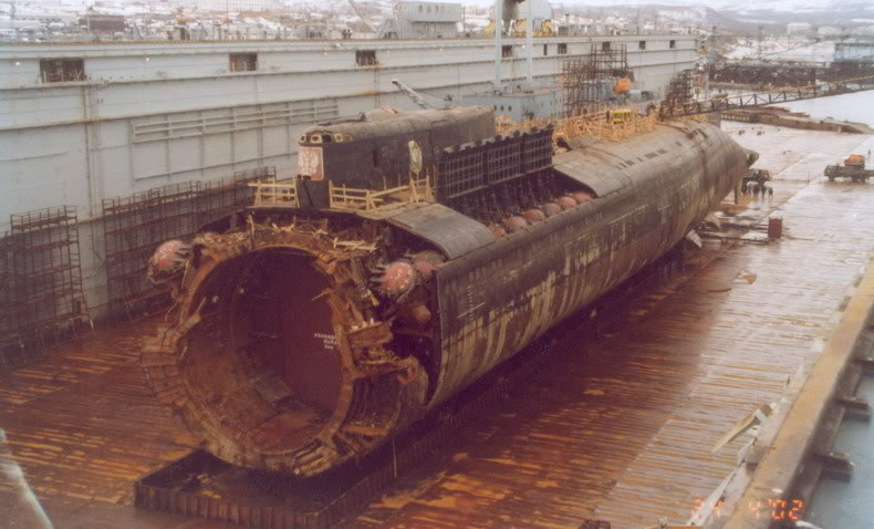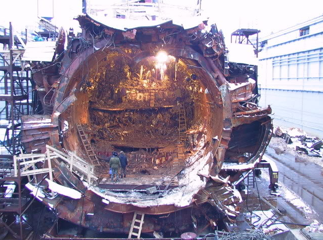 Xác con tàu sau khi được trục vớt lên bờ. Một tuần sau khi tai nạn xảy ra, đội cứu hộ có thể tiếp cận bên trong tàu, nhưng toàn bộ 118 người đều thiệt mạng. Theo báo cáo đáng tin cậy nhất cho tới nay, nguyên nhân của vụ nổ là do một trong những ngư lôi chứa hóa chất hydrogen peroxide (HTP) trên mũi tàu gặp sự cố, phát nổ và làm chìm tàu trong khi có những giả thuyết khác thậm chí cho rằng tàu bị hải quân nước khác đánh chìm.