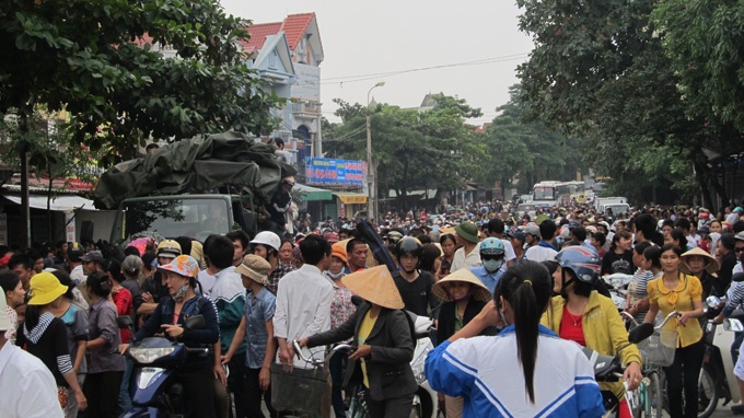 | Nhiều người dân đi theo xe ô tô chở quan tài mẹ con sản phụ Nguyễn Thị Xuân, gây tắc đường trên quốc lộ 45, đoạn qua thị trấn Vạn Hà, huyện Thiệu Hóa (Thanh Hóa) trưa 19/10. |